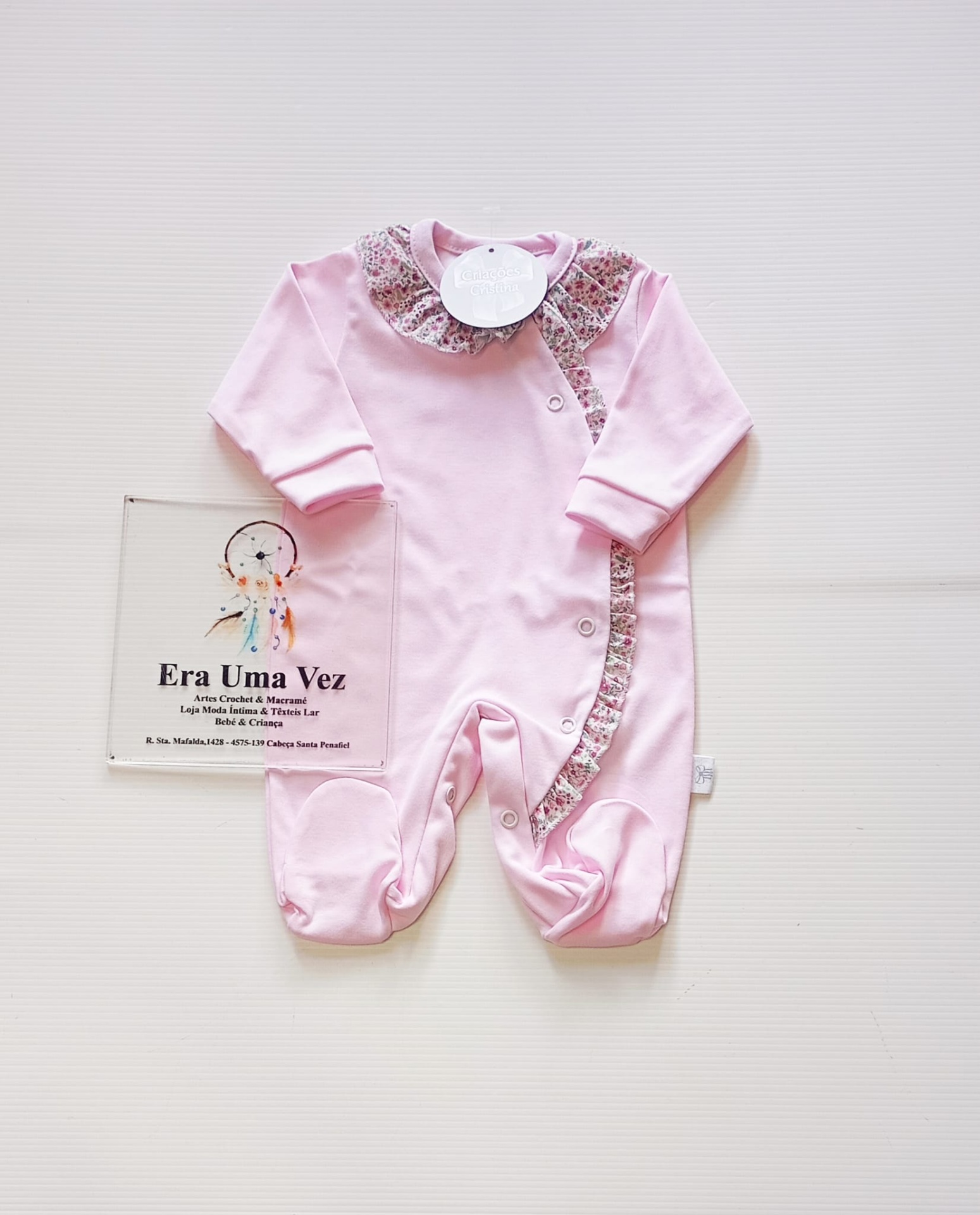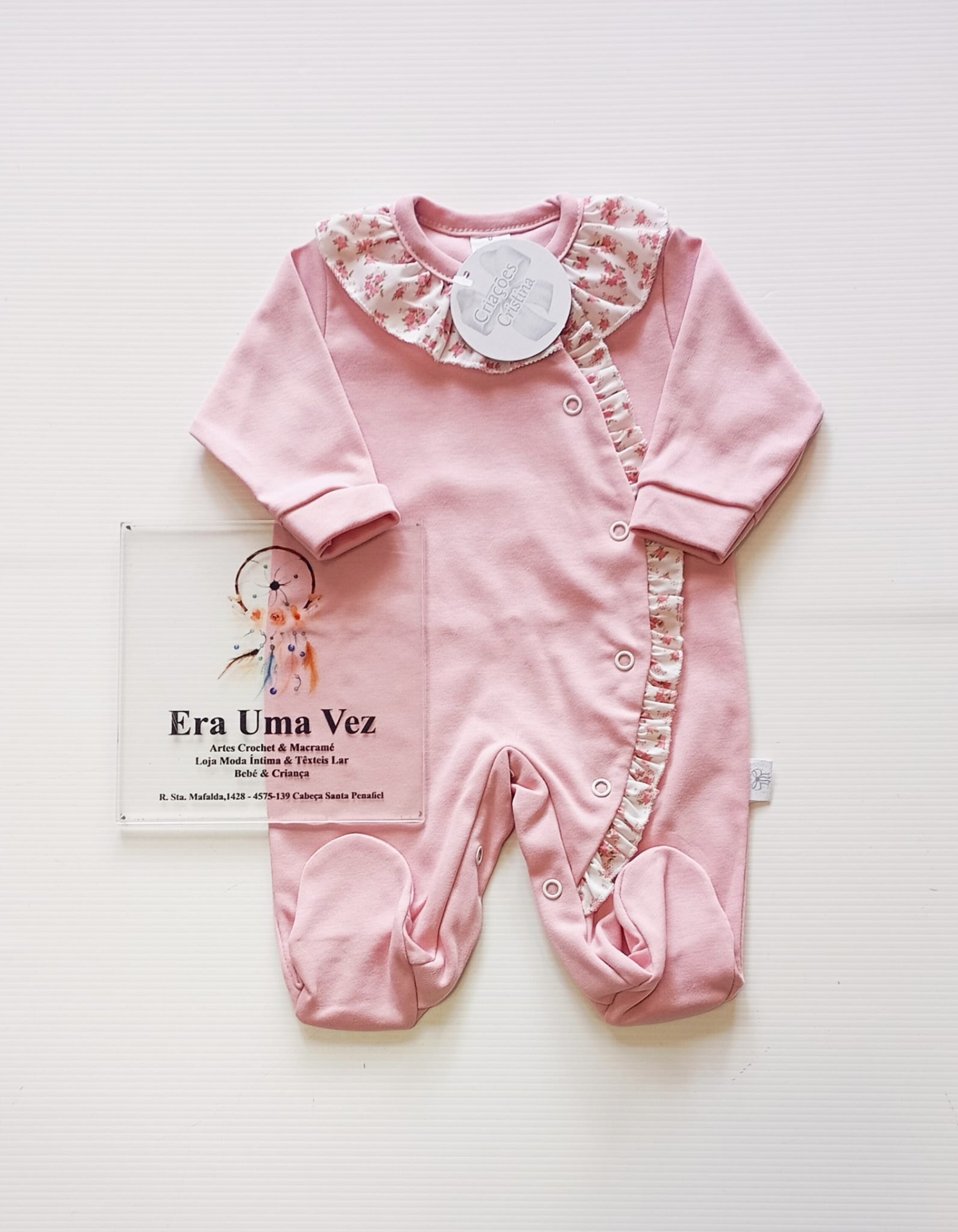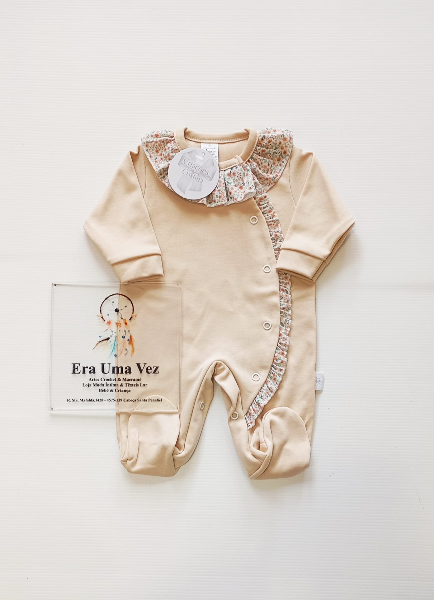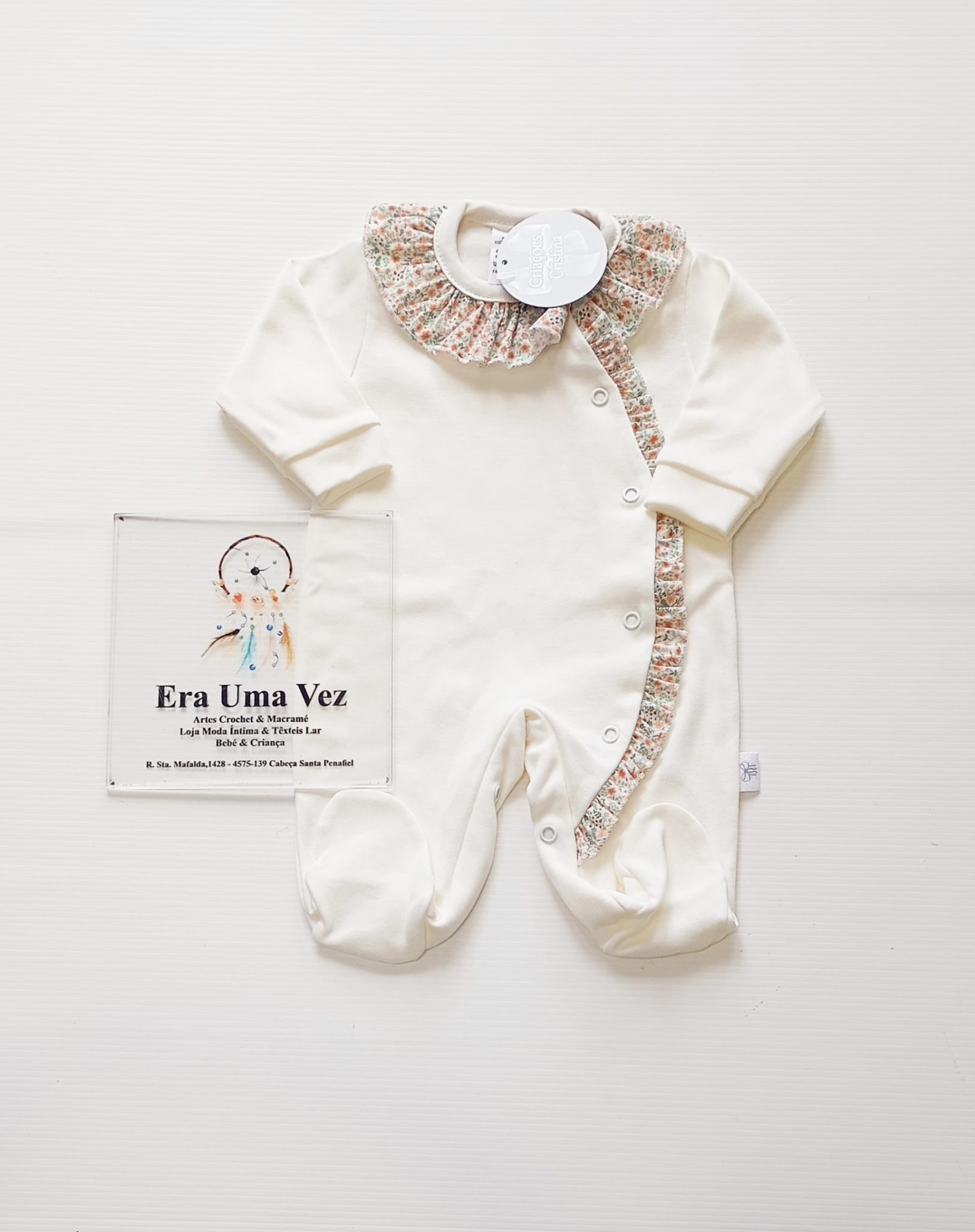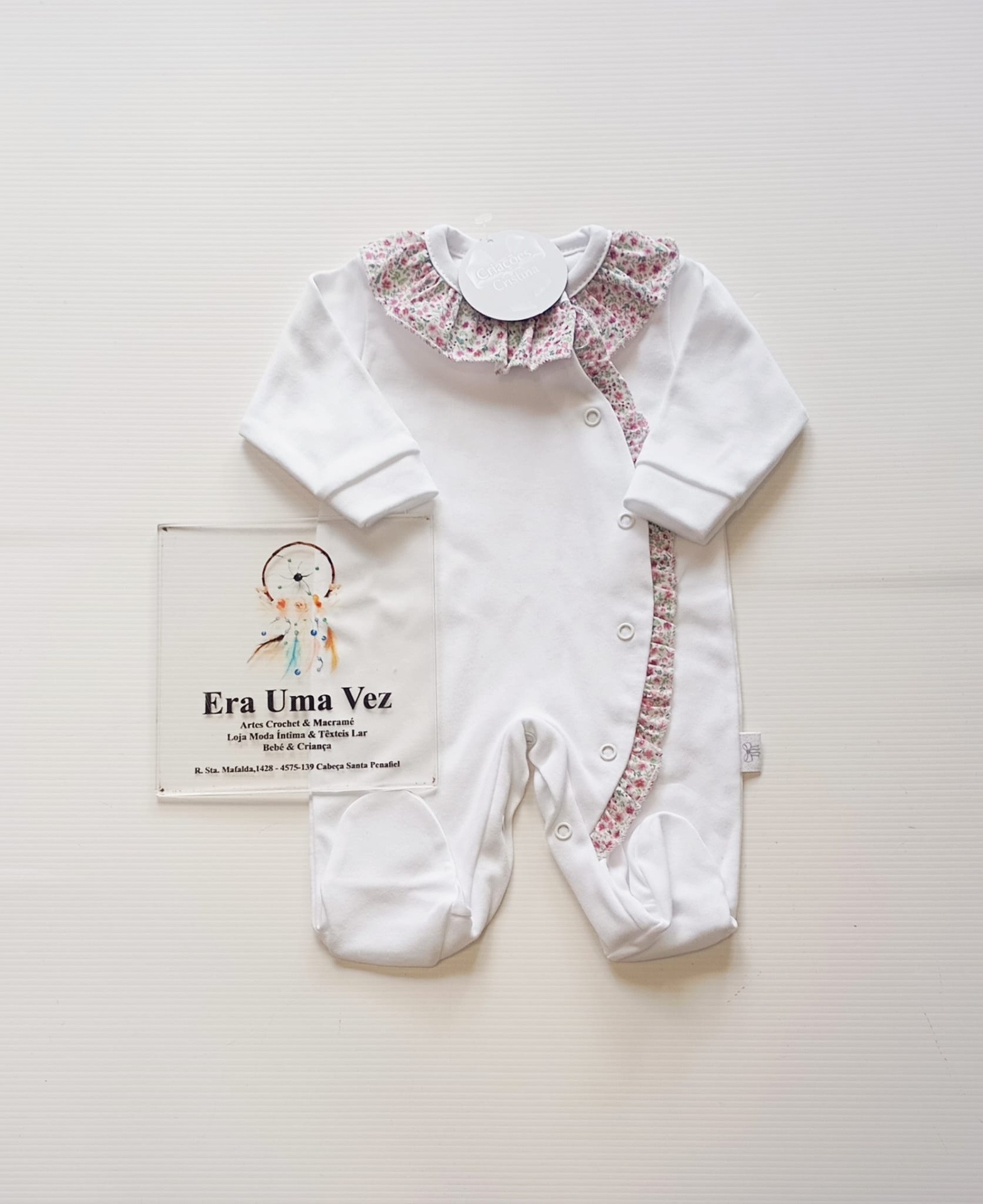 O design delicado destaca-se pela gola elegante e pelo folho lateral, que acrescentam um toque clássico e sofisticado. A abertura em molas facilita a muda da fralda e o vestir, tornando-o prático para o dia a dia.