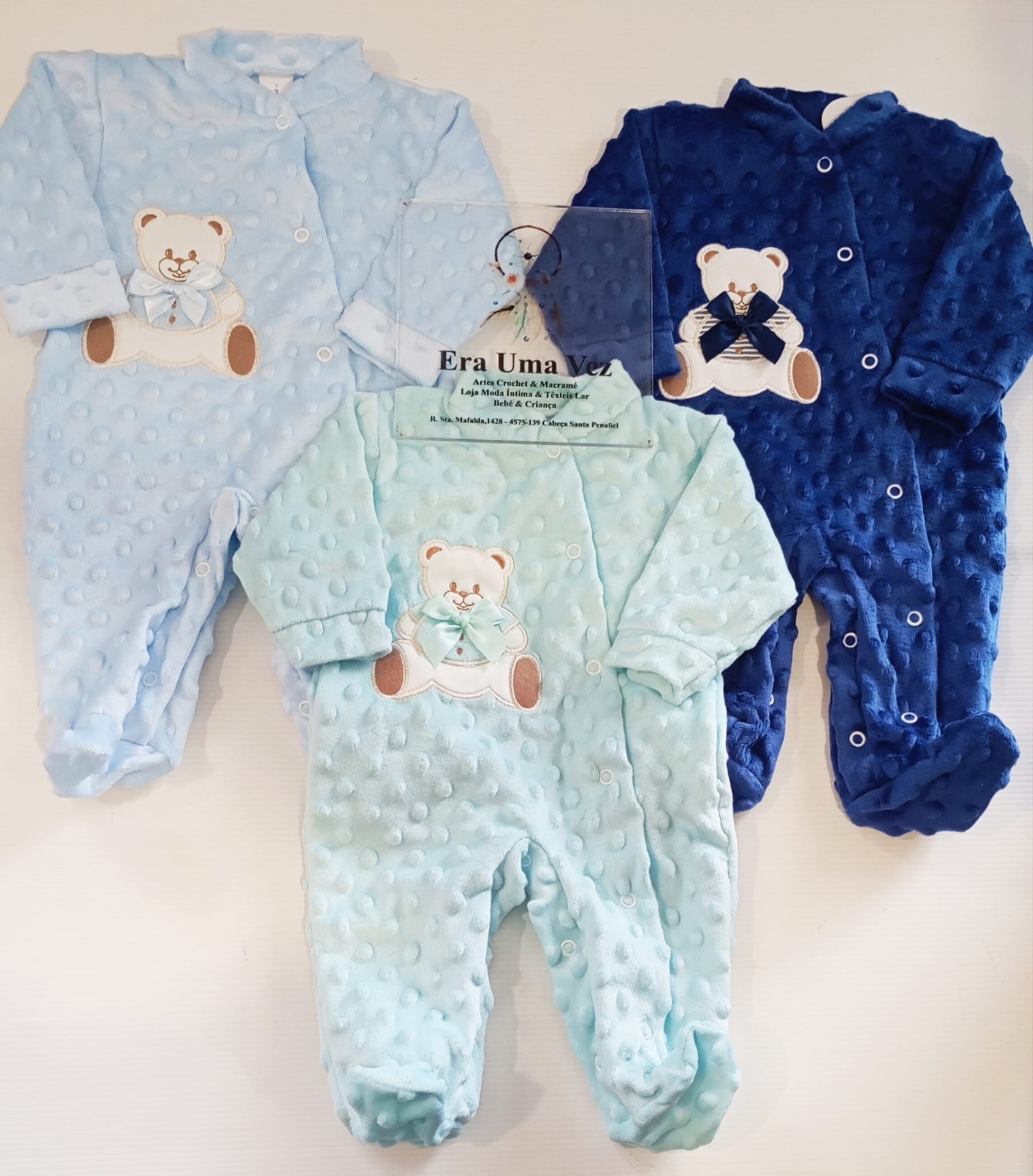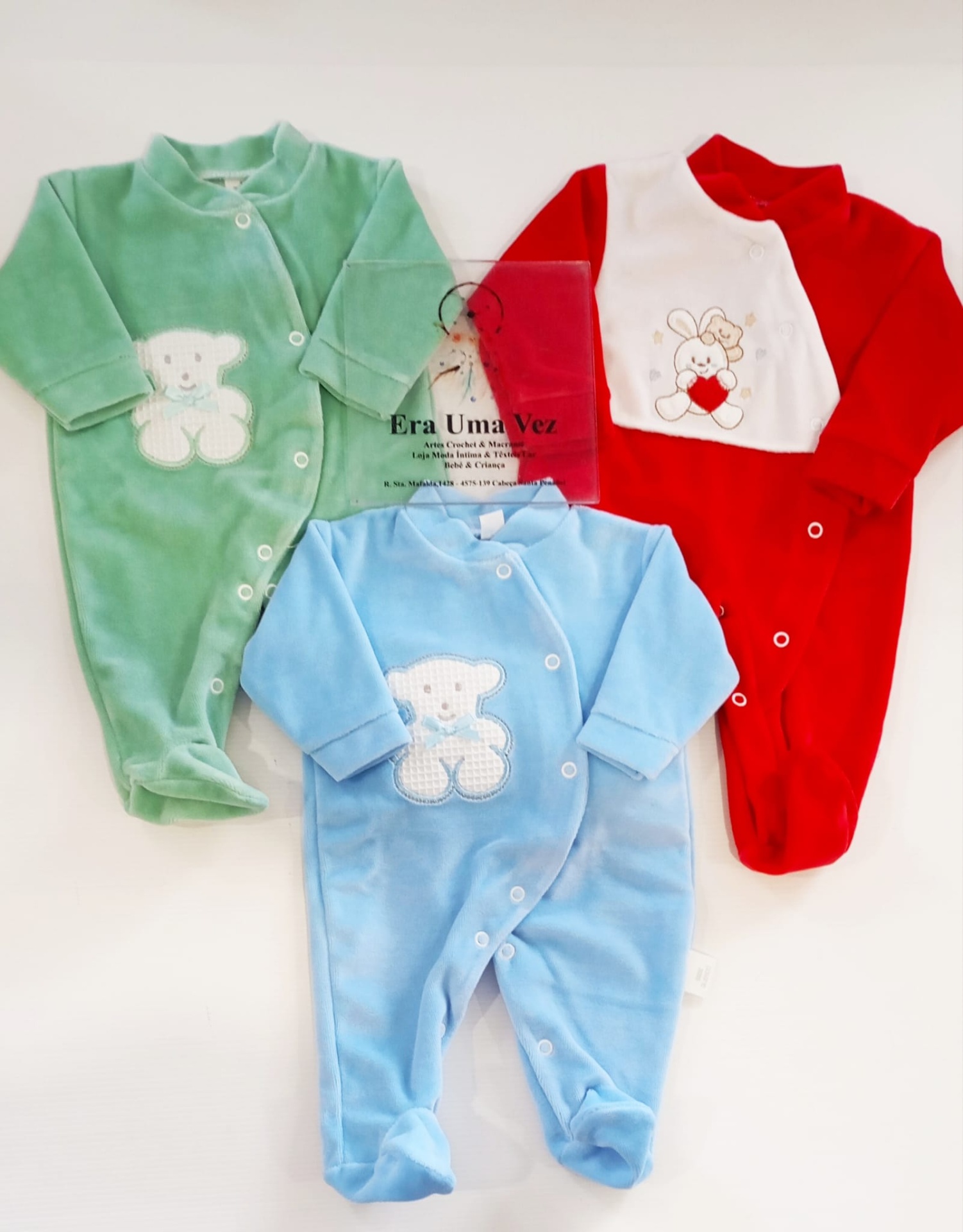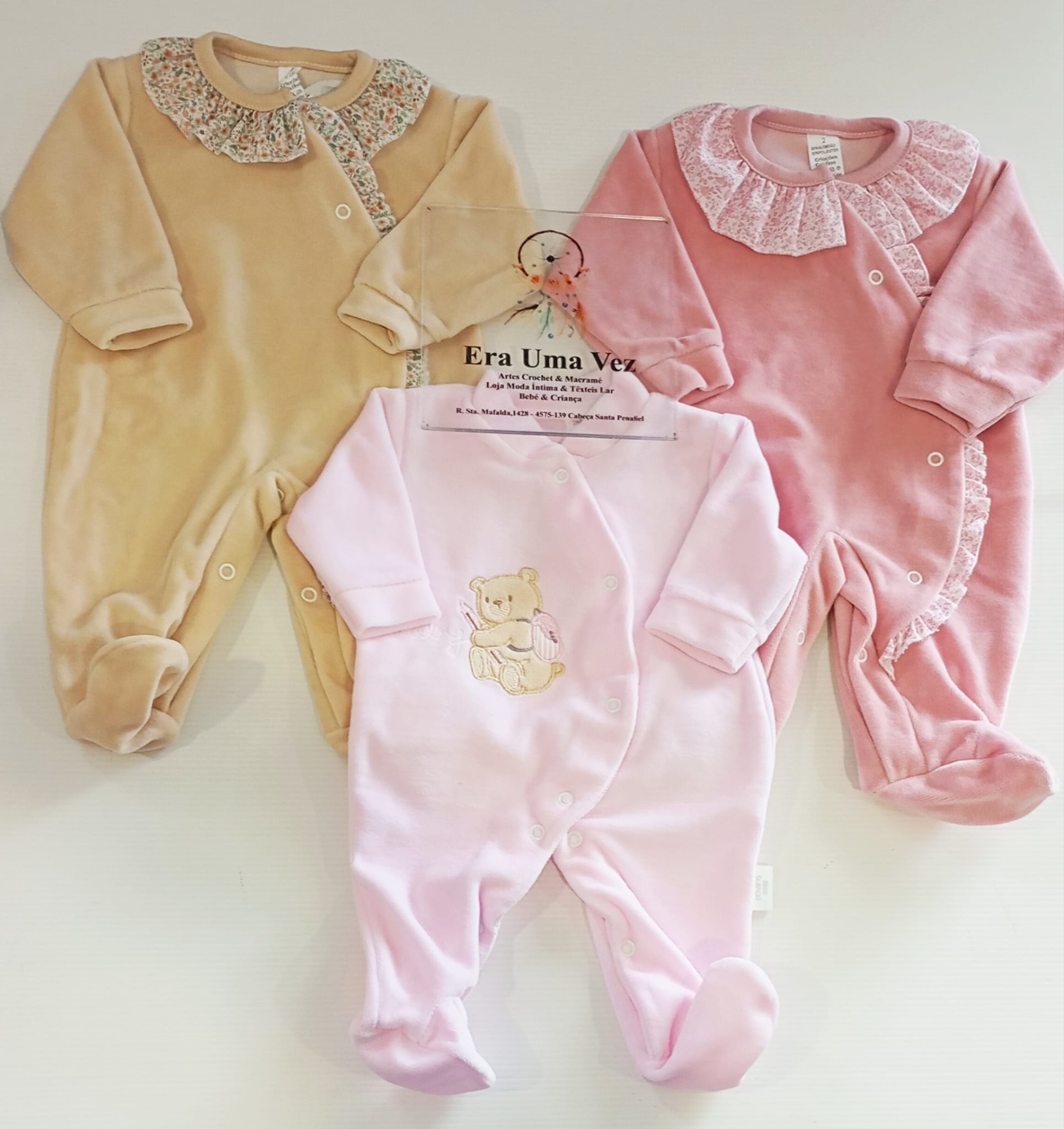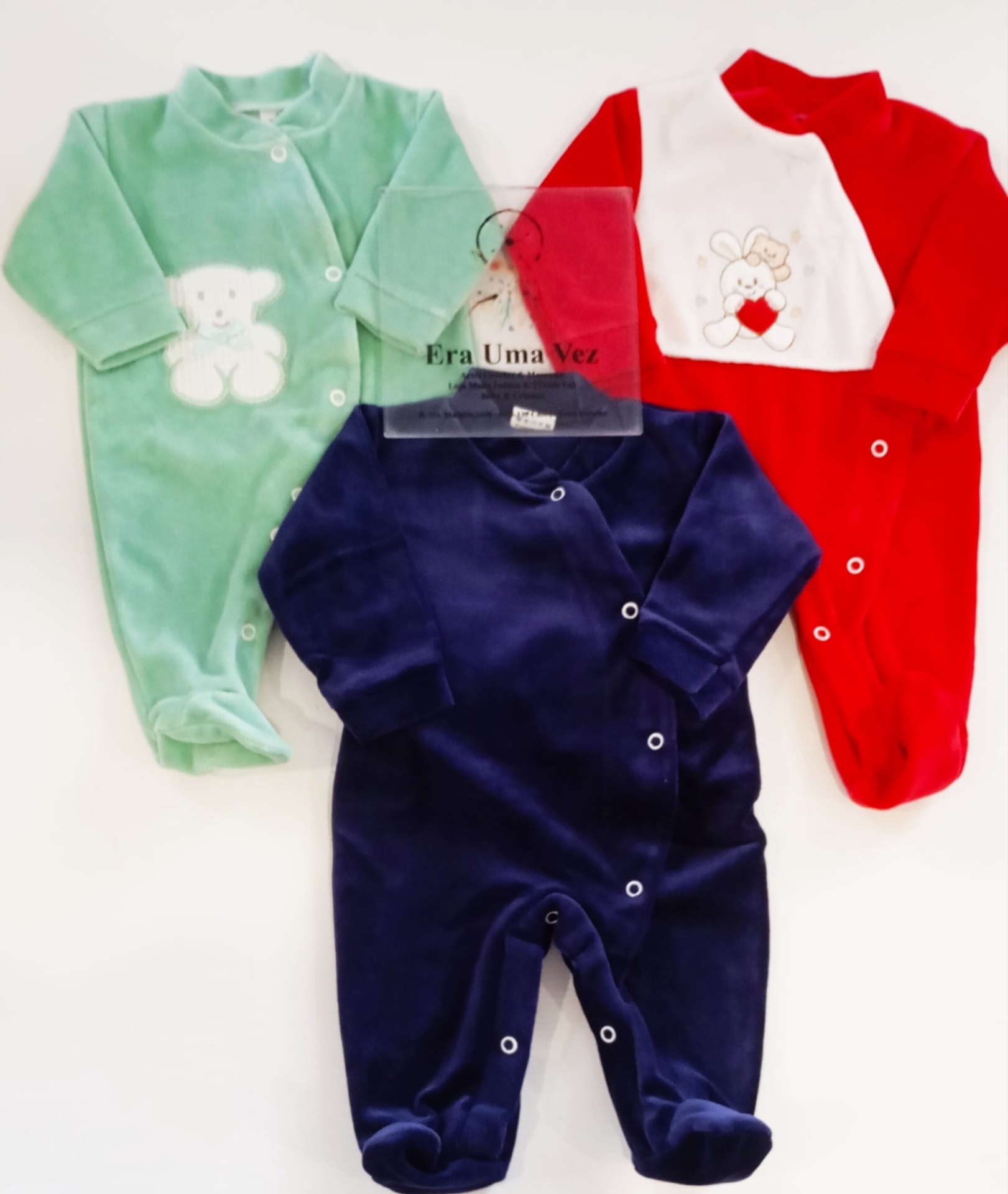 Conjunto de babygrows em veludo, macios e confortáveis, ideais para manter o bebé quentinho no dia a dia.