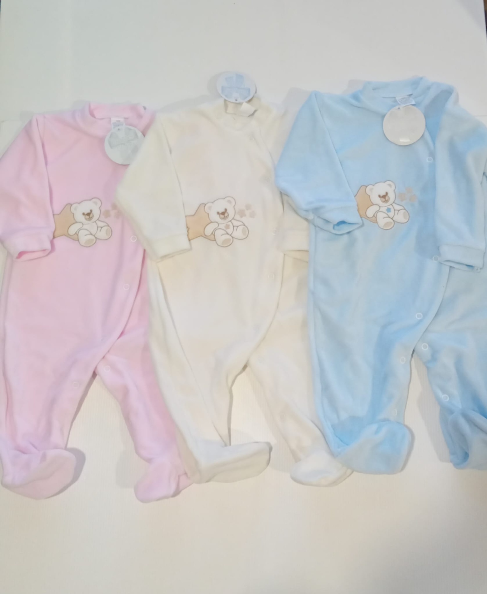 Três macacões de bebé rosa, branco e azul com estampa de ursinho e botões frontais
