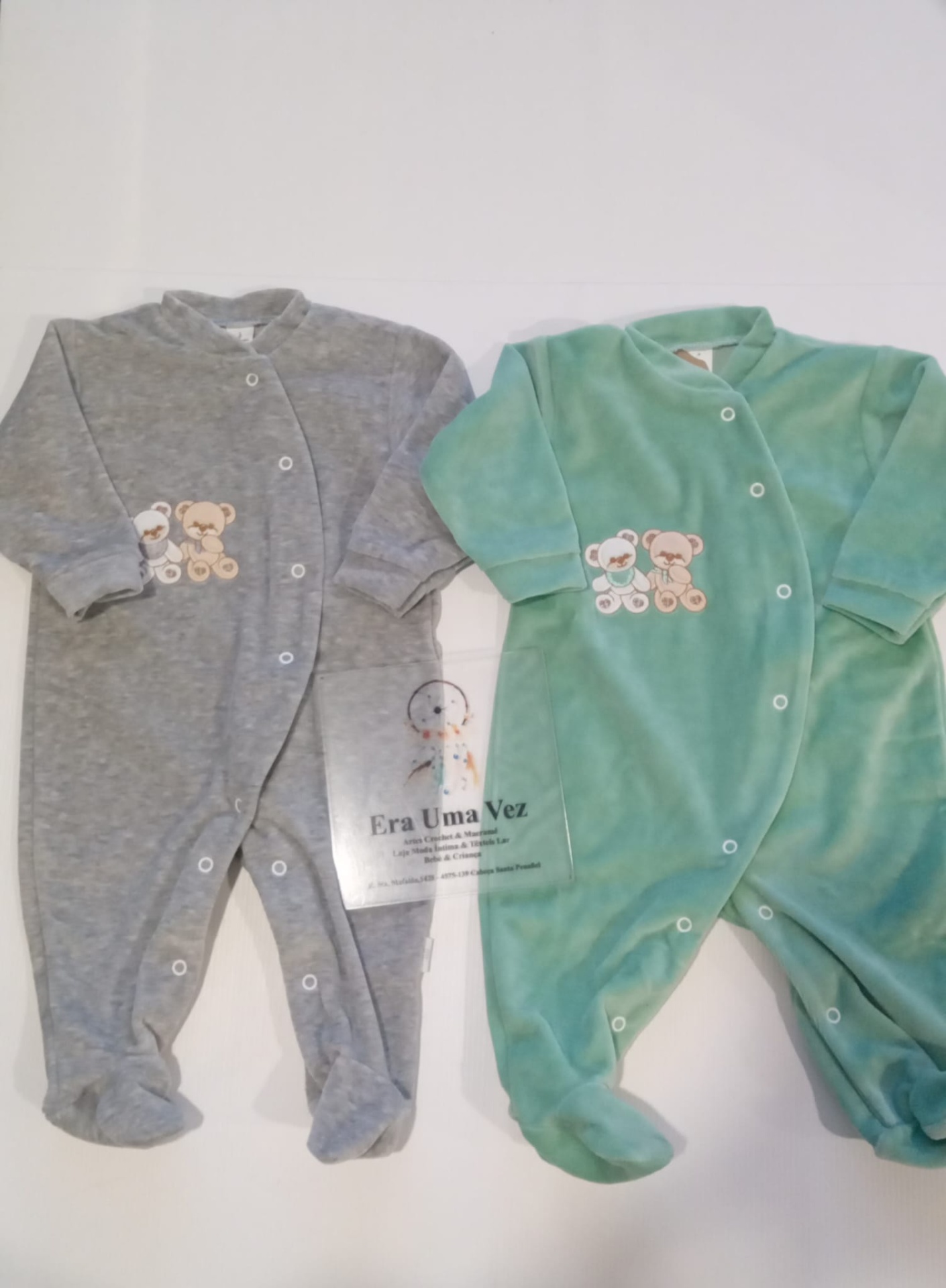 Dois macacões de bebé, um cinza e outro verde, com ursinhos bordados