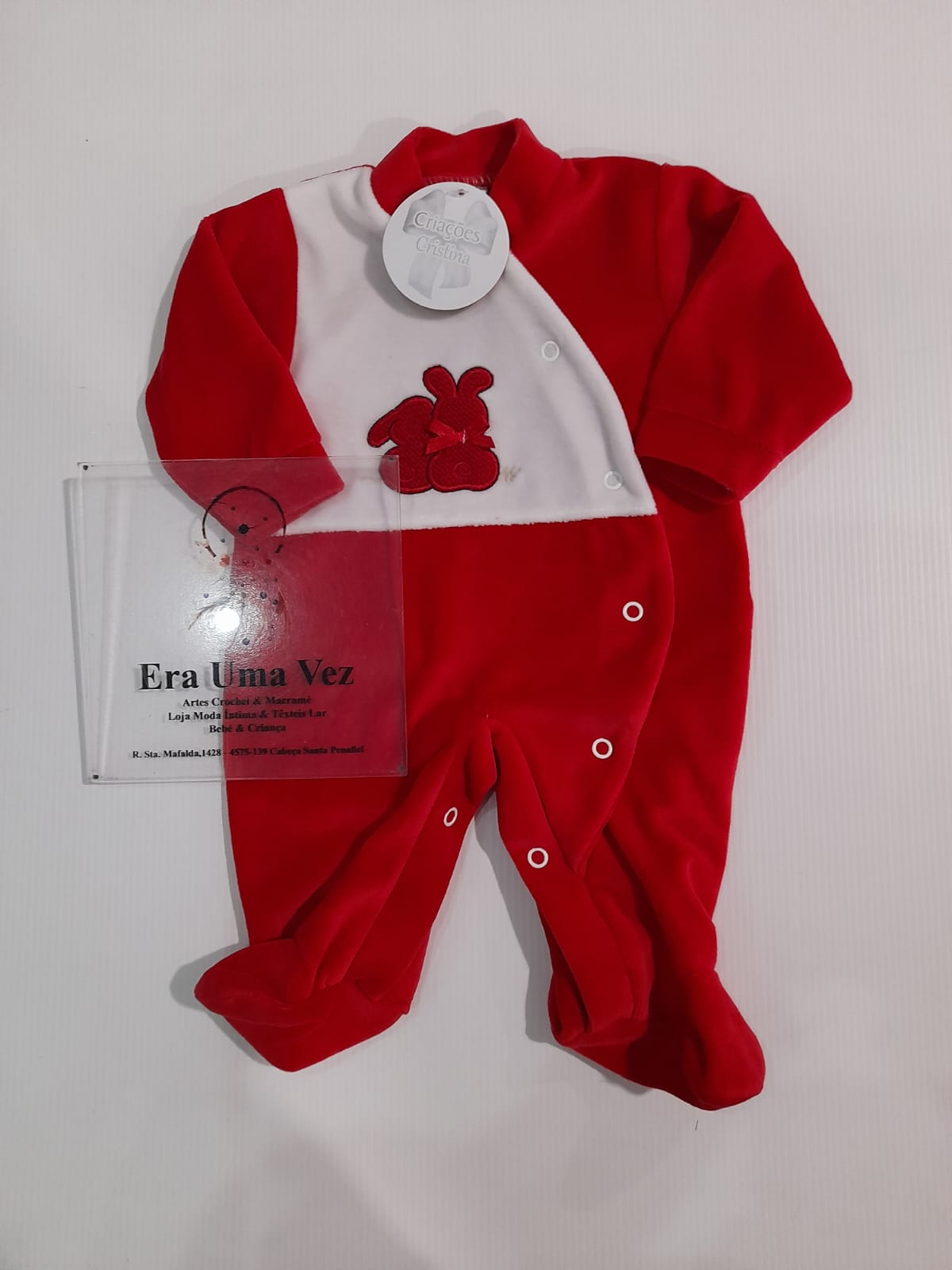 Macacão de bebé vermelho e branco com aplicação de coelhos e botões de pressão.