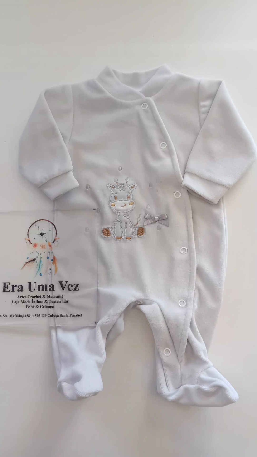 Pijama de bebé branco com bordado de girafa e fechos de pressão