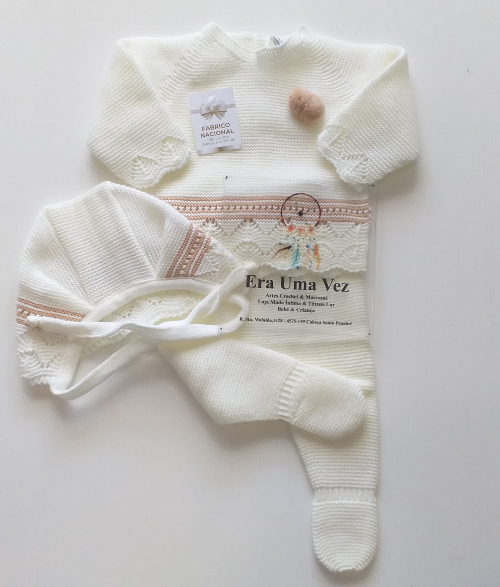 Conjunto de bebé em tecido de malha com três peças: camisola com  abertura de botões. calça e touca.