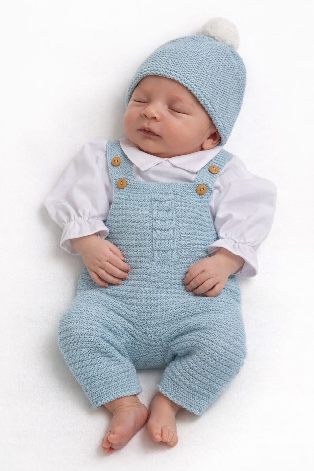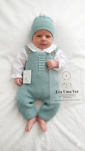 Jardineira, blusa e gorro de bebé