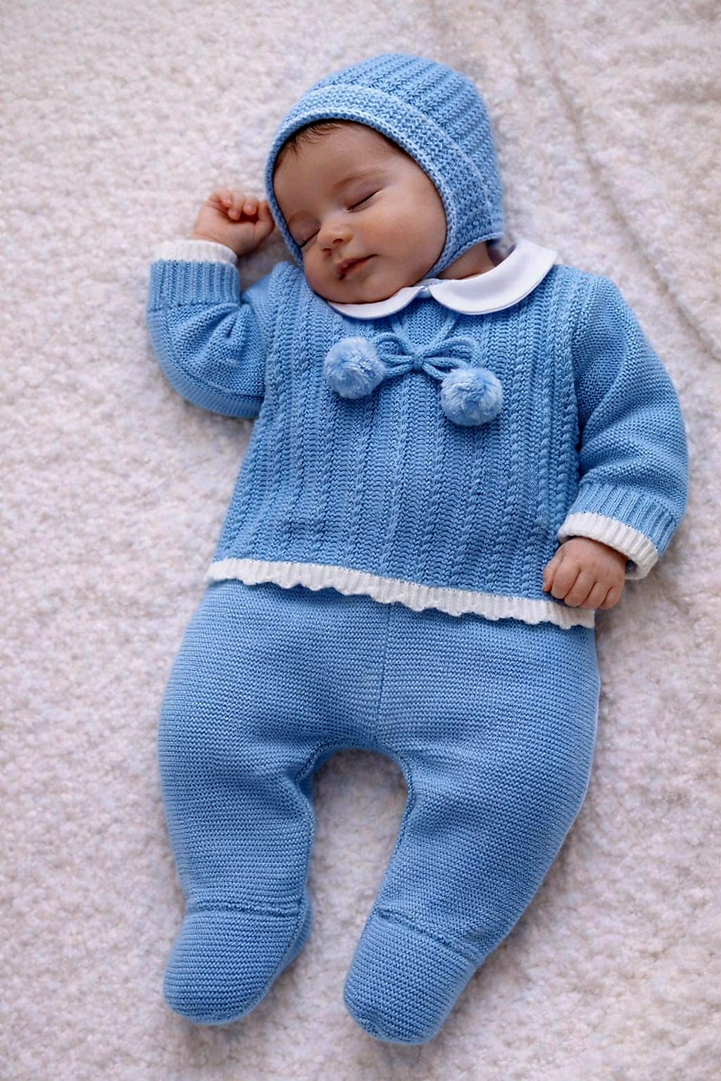 Bebé a dormir vestido com roupa de malha azul com detalhes brancos e chapéu a condizer, deitado numa manta felpuda branca.