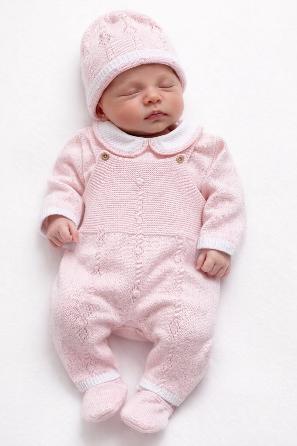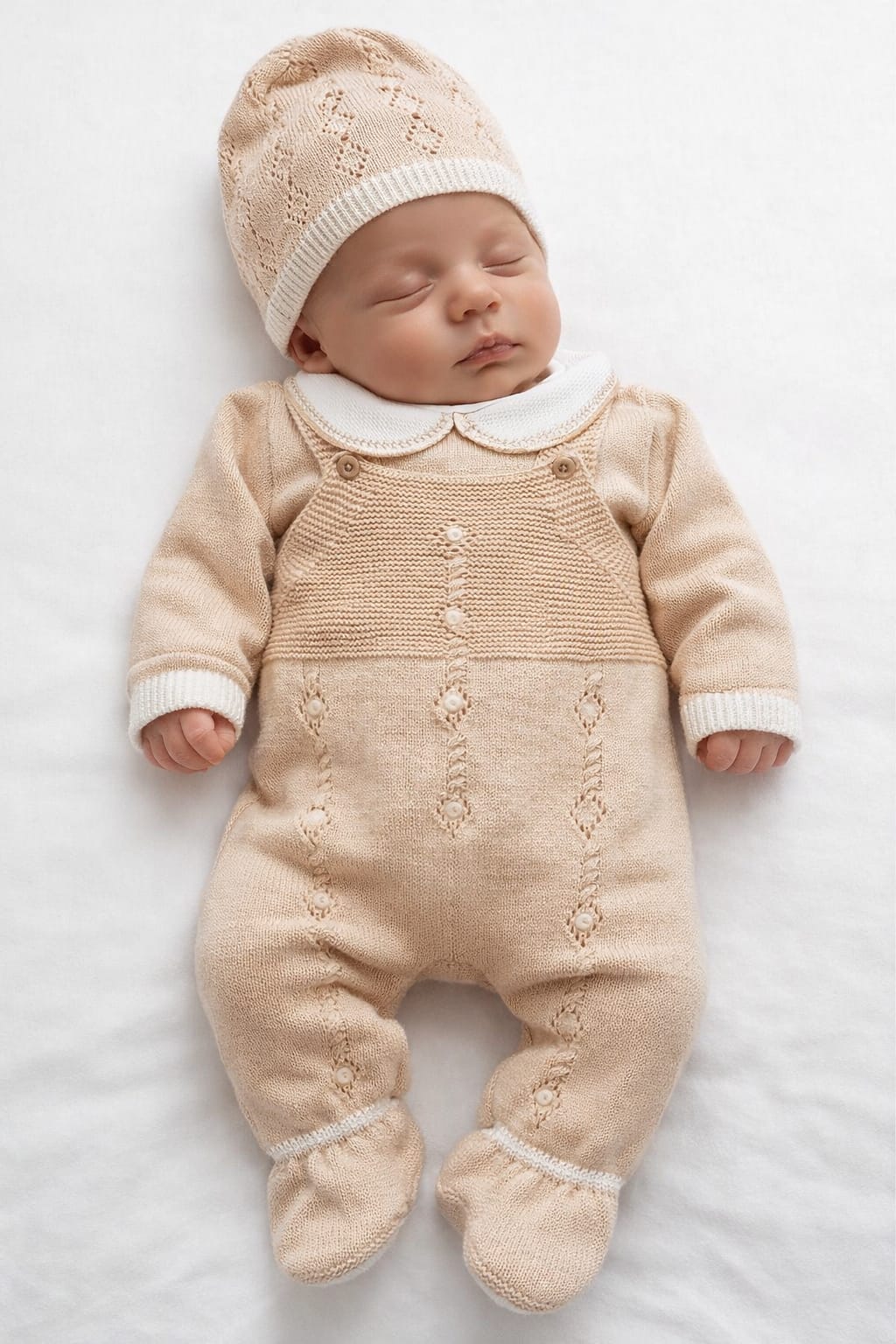 Bebé vestido com macacão e gorro de malha bege e creme, deitado sobre fundo branco.