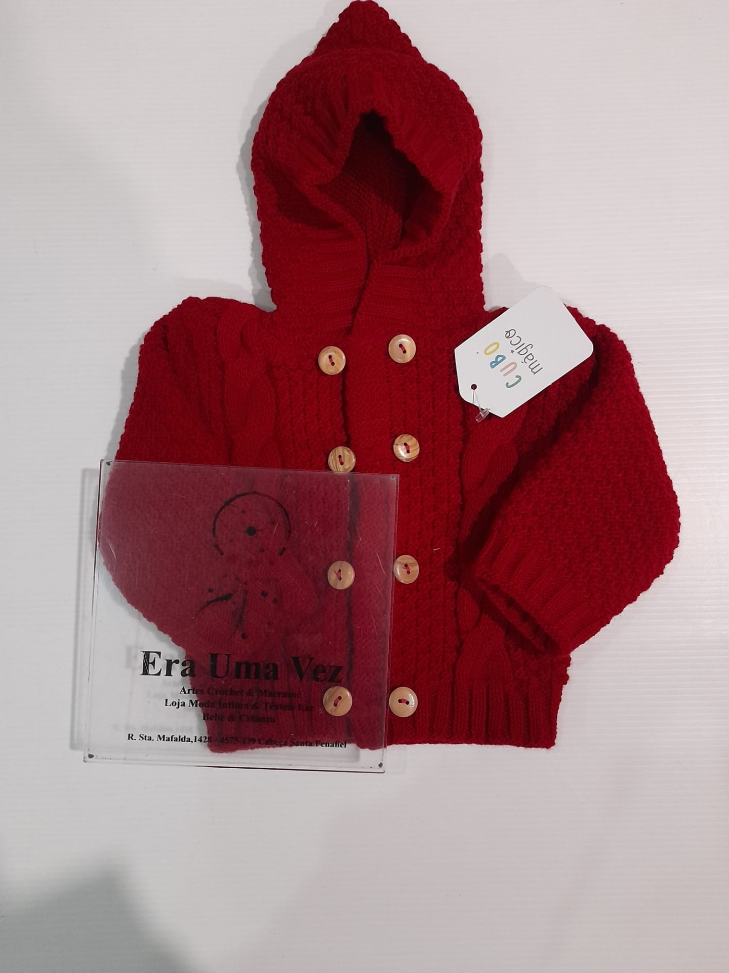 Casaco vermelho de malha com capuz e botões em madeira clara
