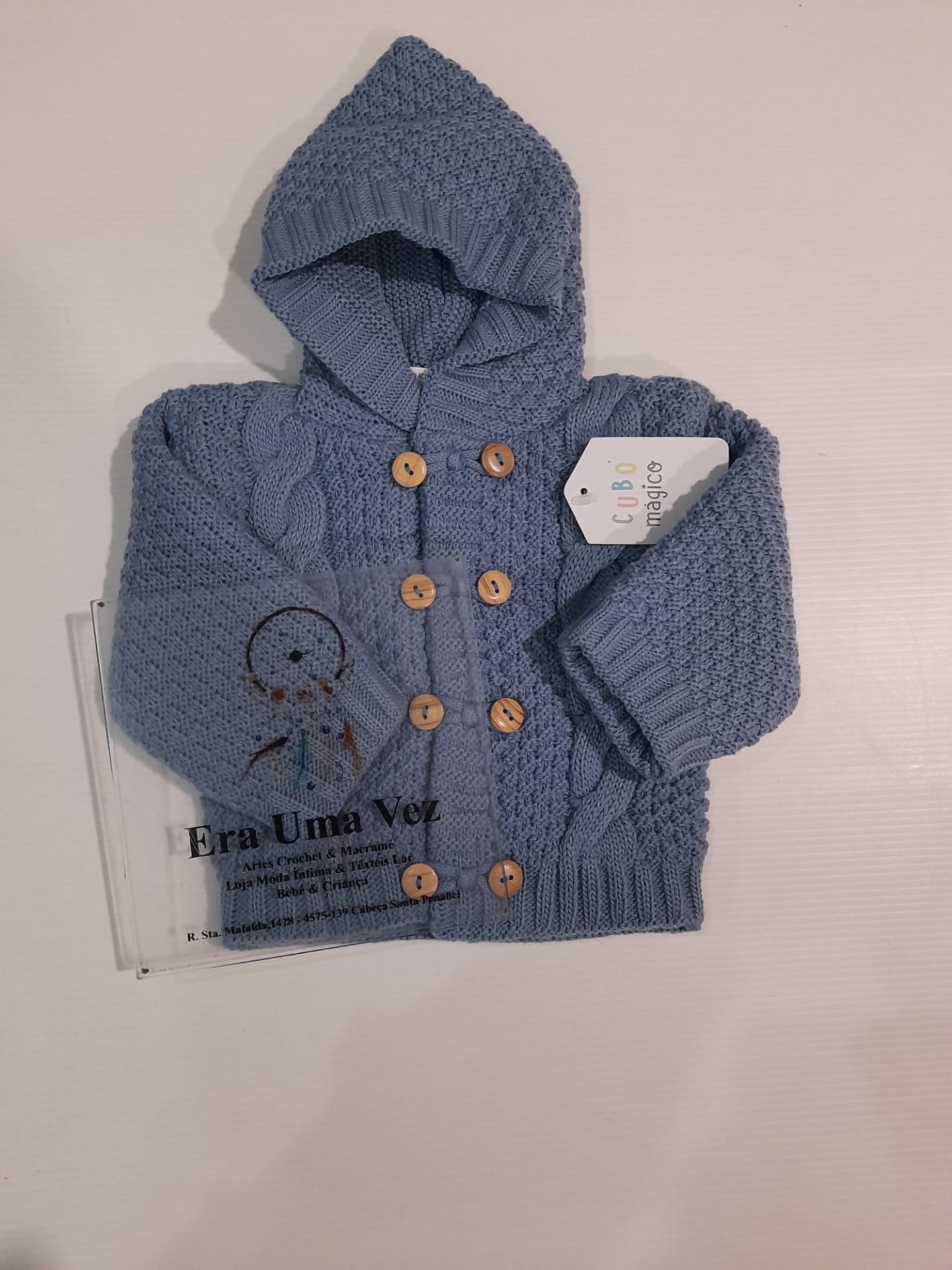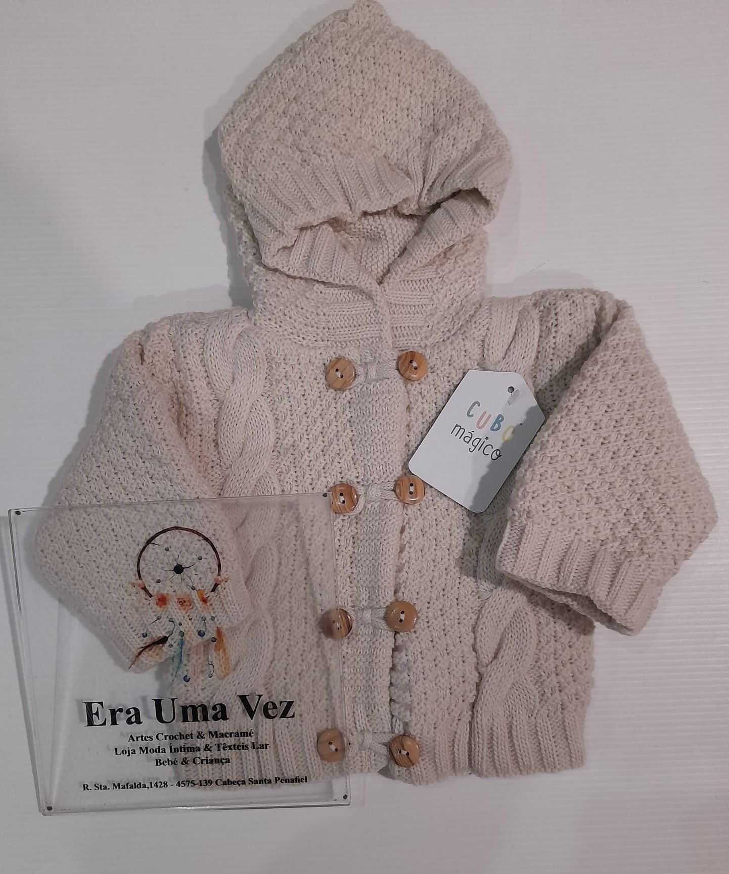 Camisola de bebé de malha grossa com capuz e botões de madeira