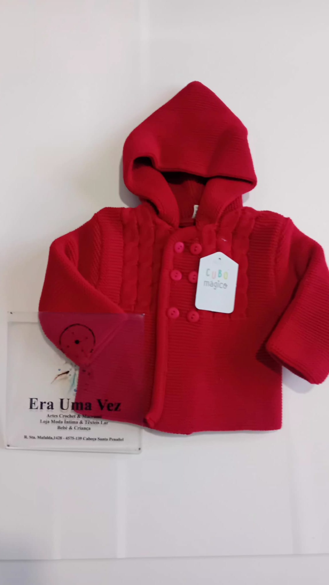 Casaco de malha azul escuro com capuz e botões com etiqueta Cubo mágico e placa Era Uma Vez