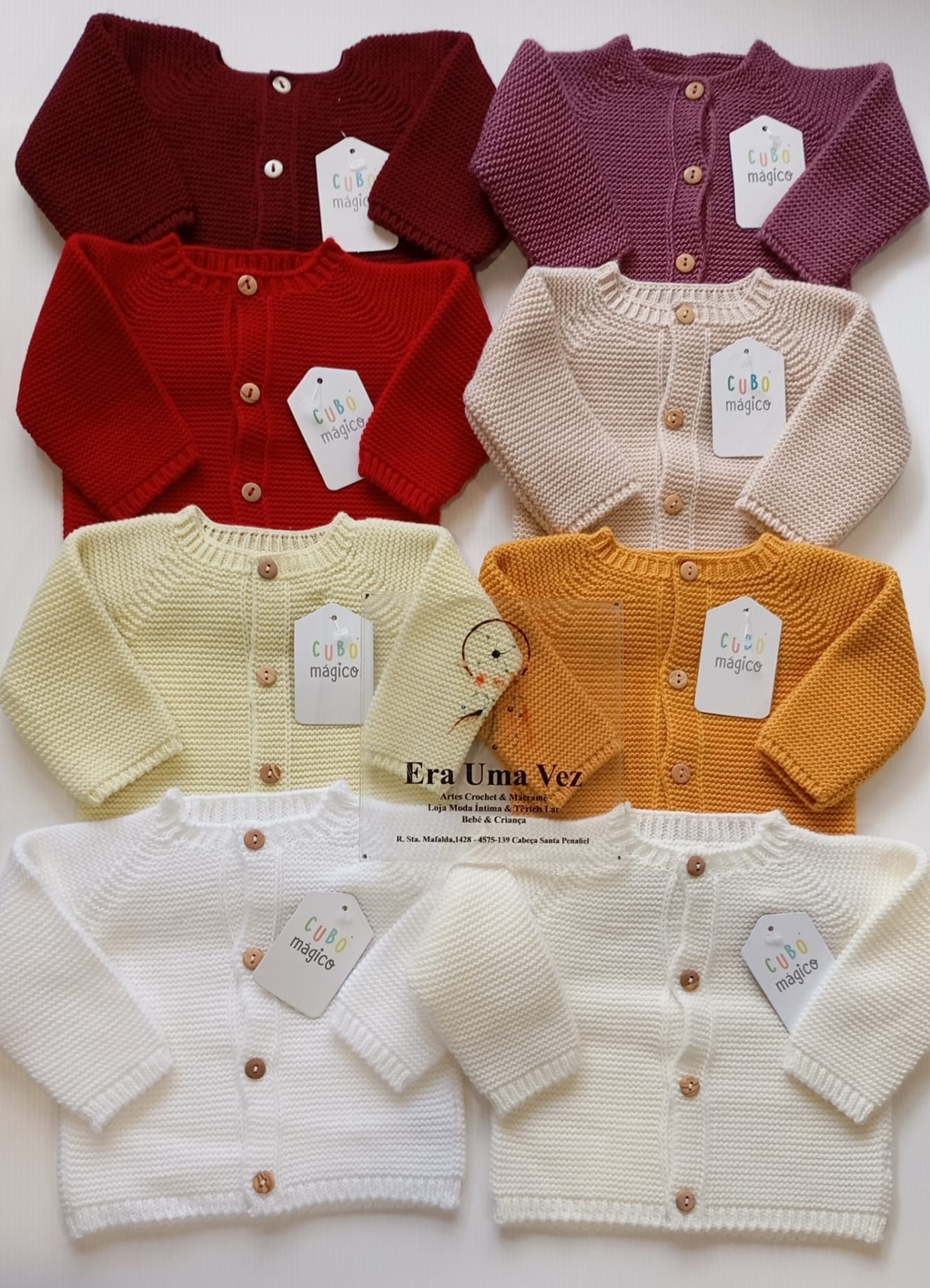 Vários casacos de malha coloridos para bebé com botões de madeira e etiquetas 'CUBO mágico'.
