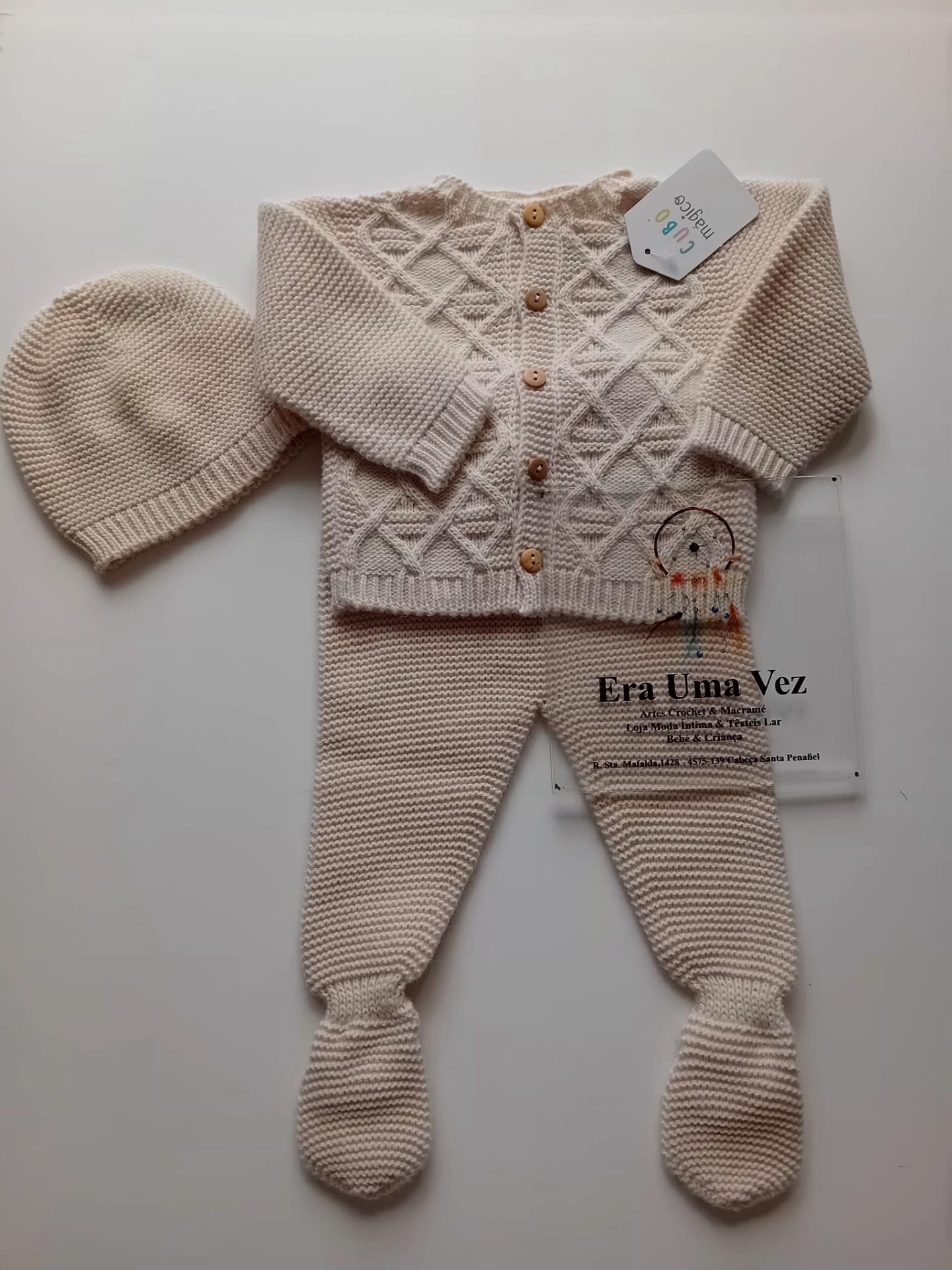 Conjunto casaco malha trabalhada,calça e gorro bebé