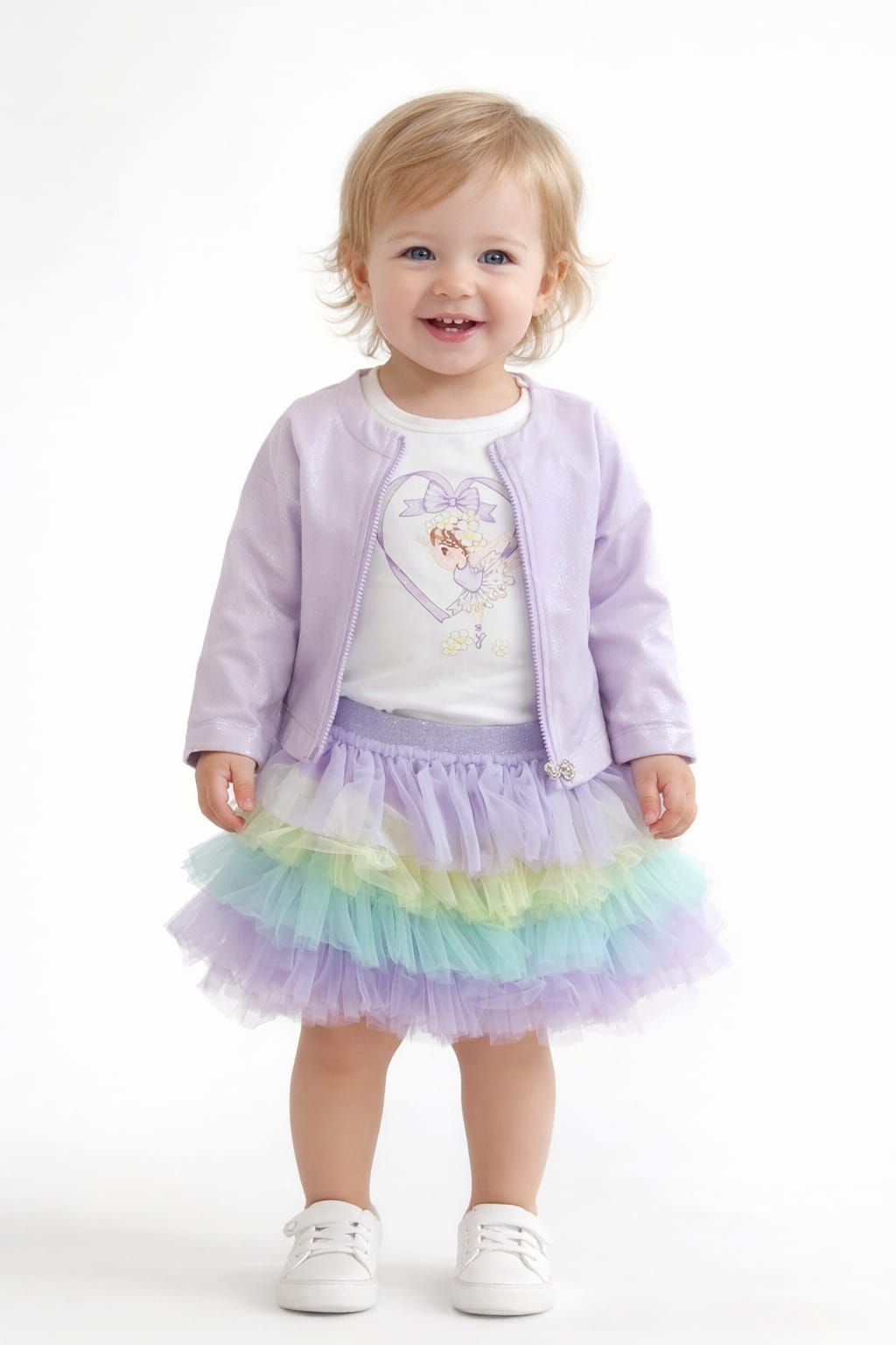 Conjunto composto por casaco , t-shirt e saia de tule colorida, perfeito para um look encantador e cheio de estilo. Ideal para ocasiões especiais ou para  o dia-a-dia com um toque de magia ✨