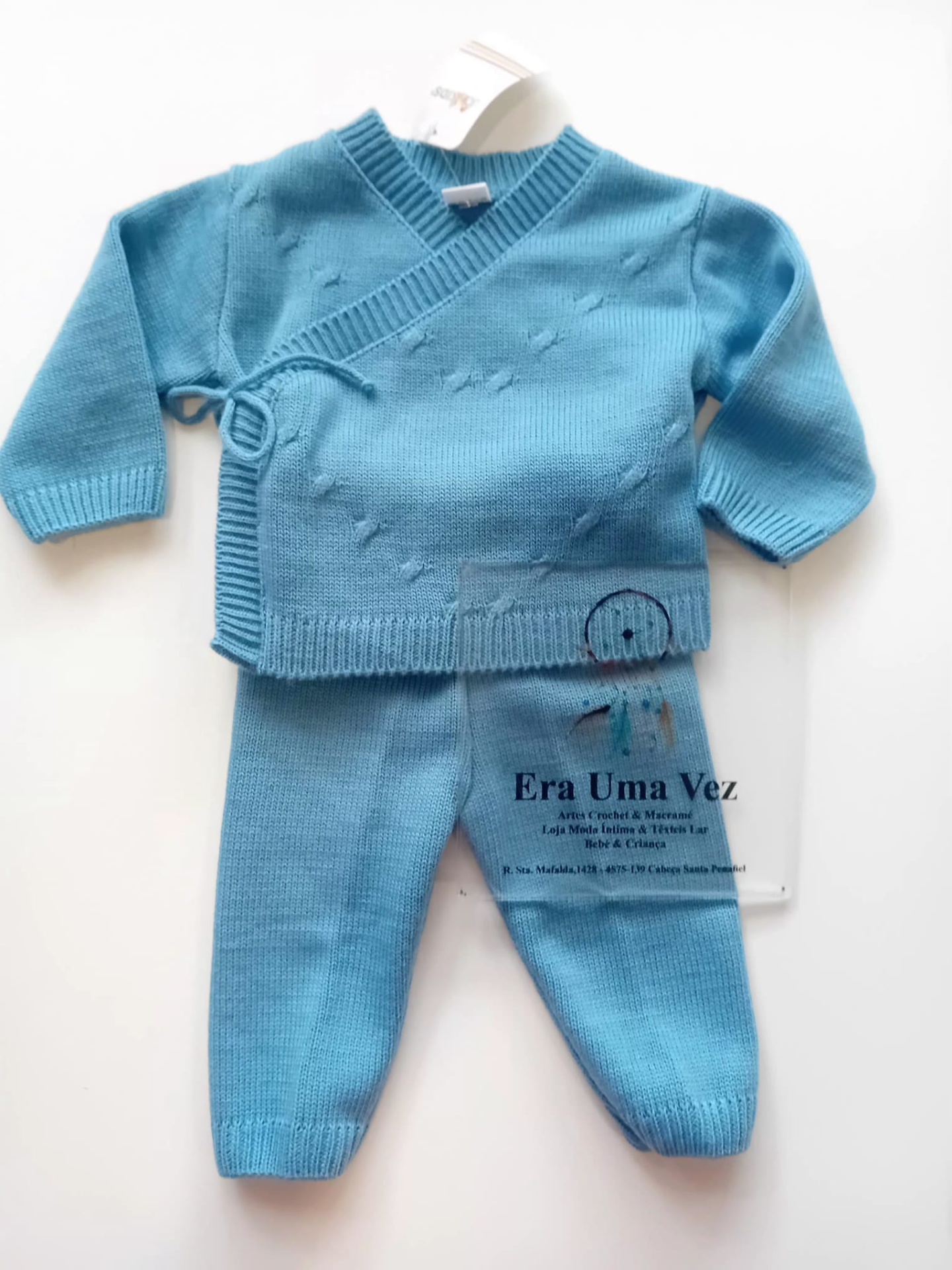 Conjunto de roupa de bebê azul claro em malha com camisola e calças