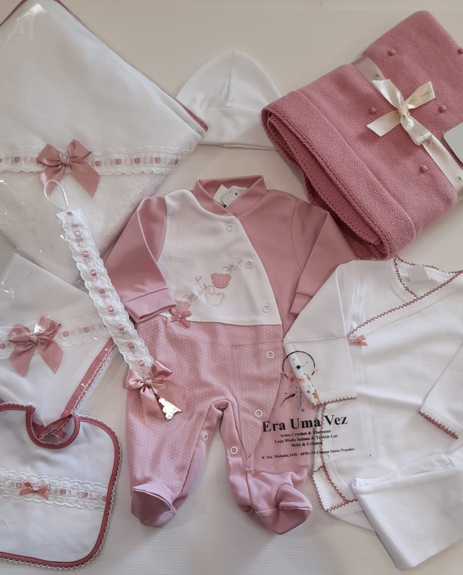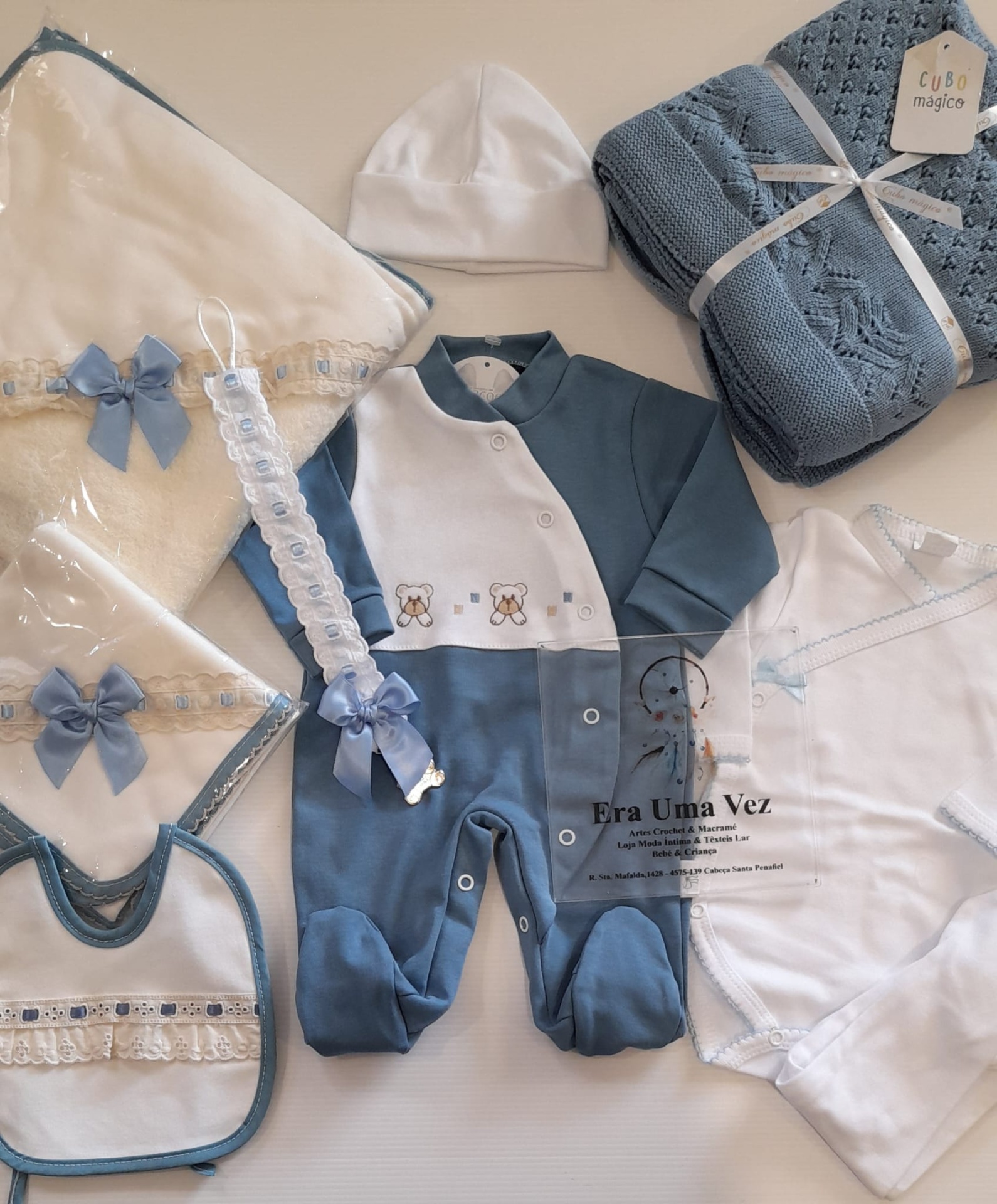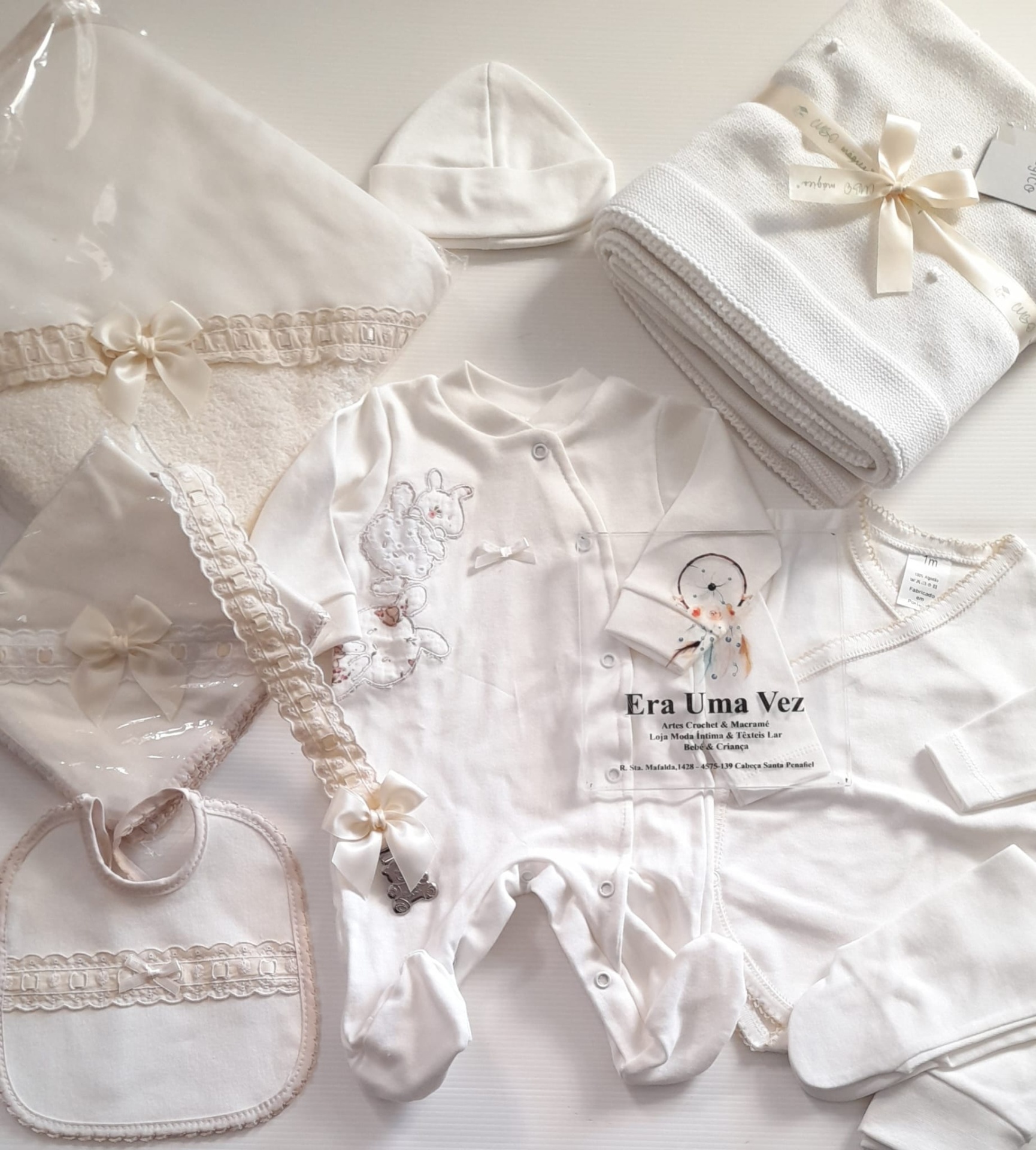 Um conjunto delicado, prático e completo, perfeito para os primeiros dias do bebé. Feito em algodão macio para garantir conforto e suavidade na pele sensível do recém-nascido.