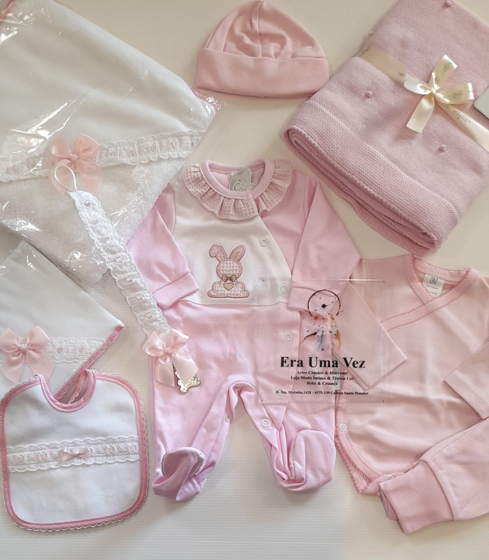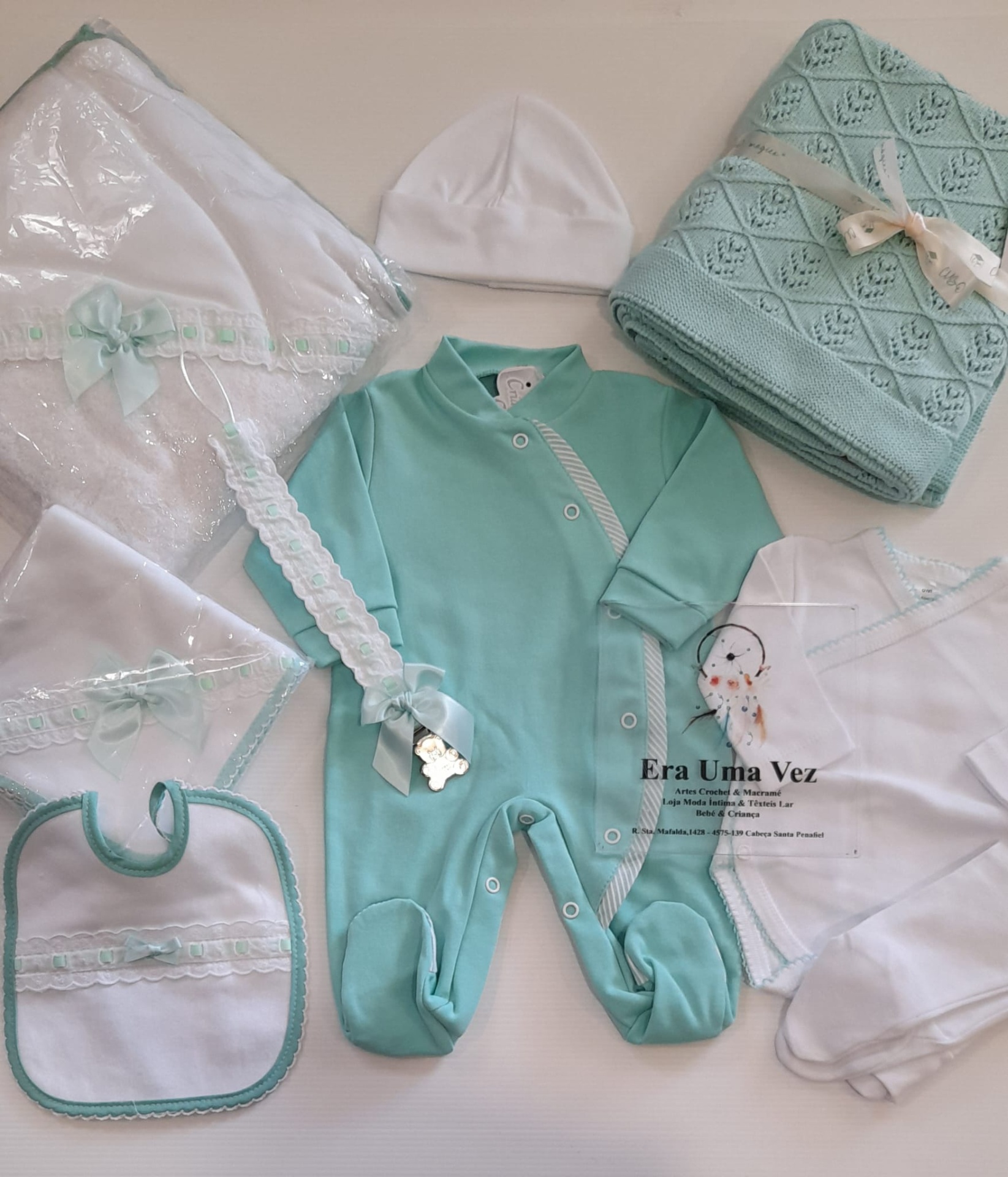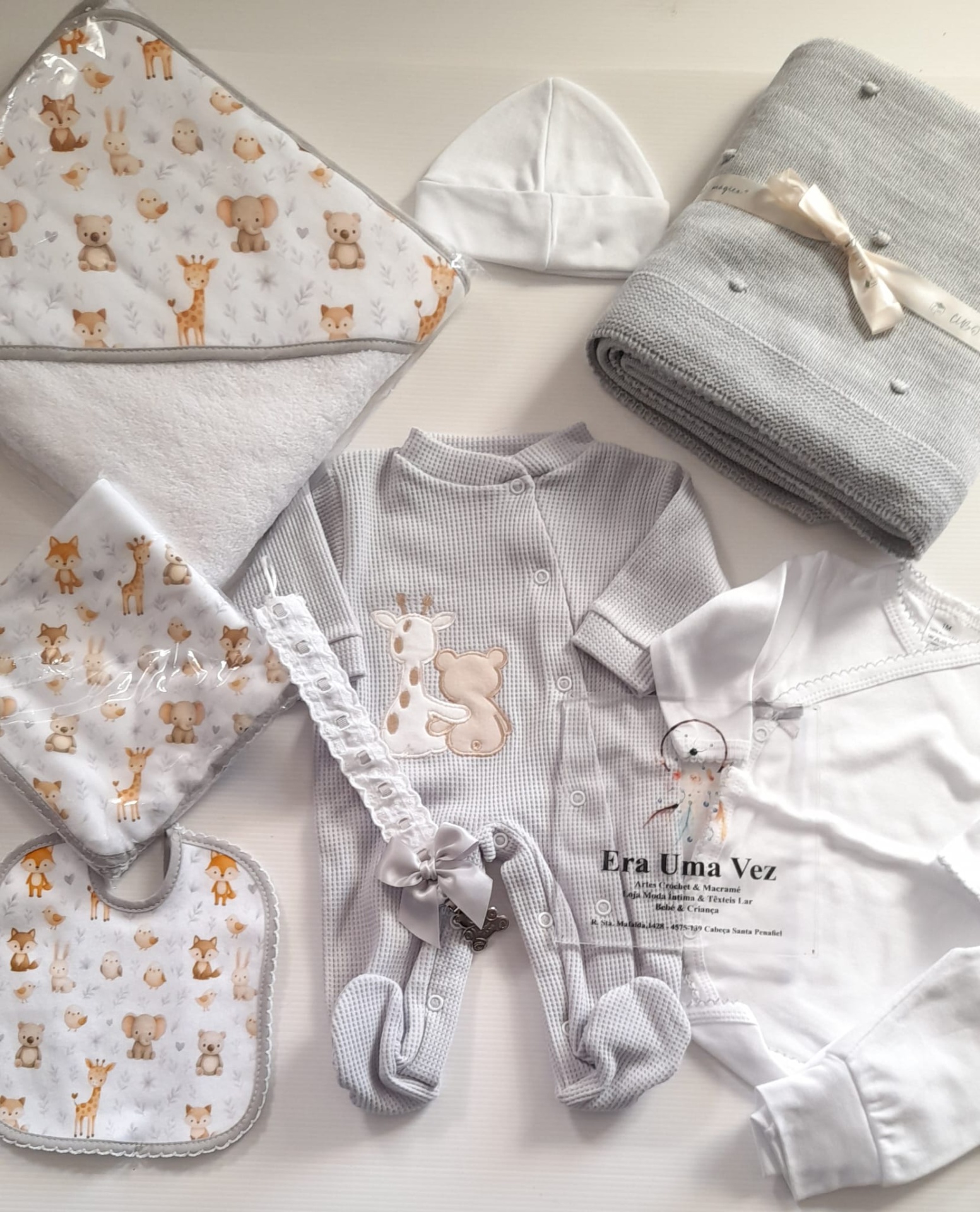 Um conjunto delicado, prático e completo, perfeito para os primeiros dias do bebé. Feito em algodão macio para garantir conforto e suavidade na pele sensível do recém-nascido.