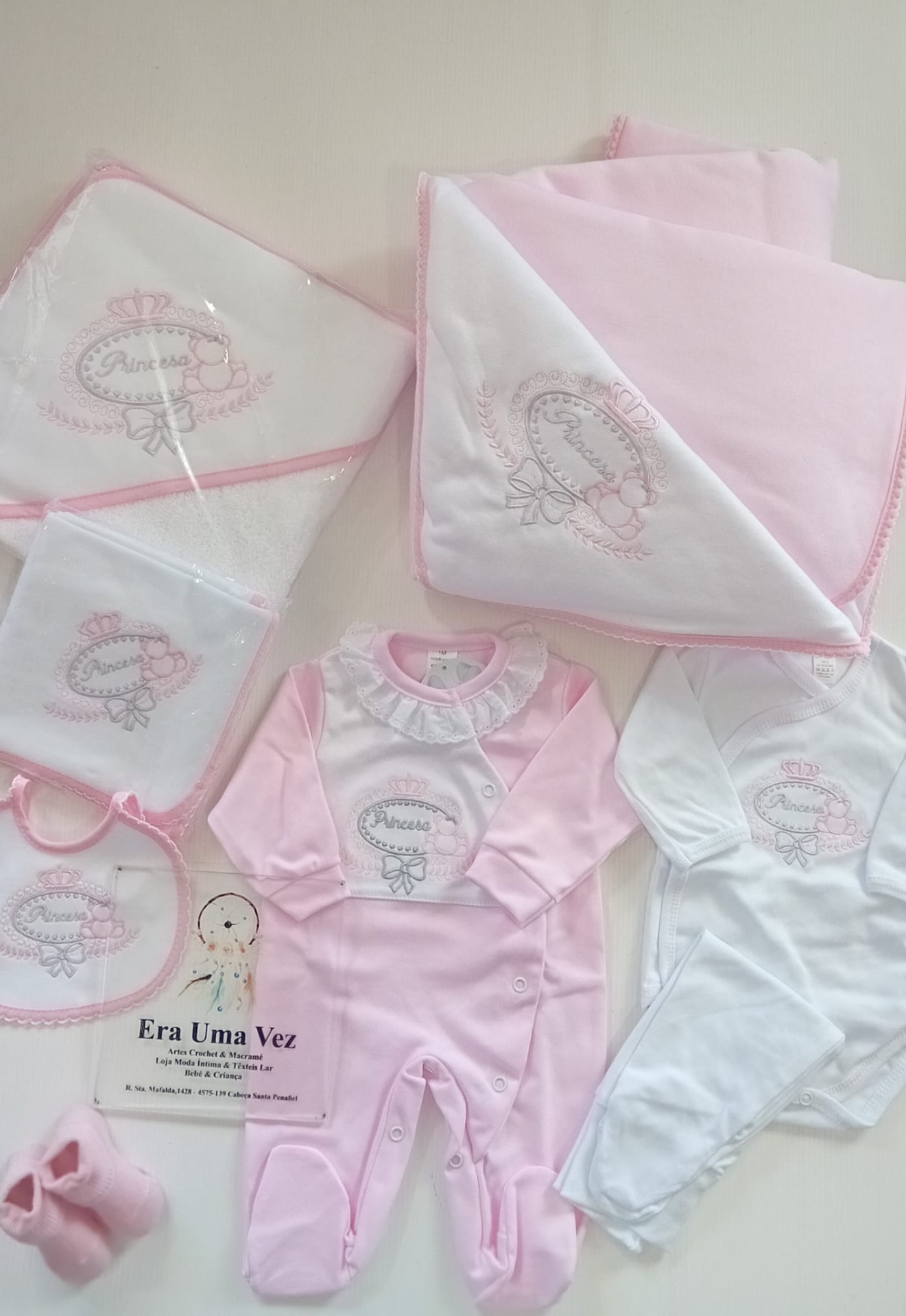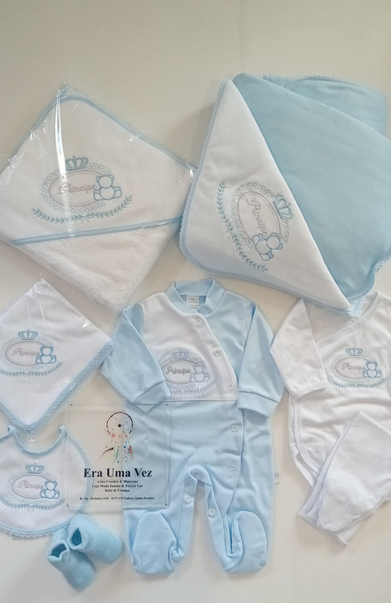 Conjunto de maternidade completo, ideal para os primeiros dias do bebé. Confeccionado em tecido macio e confortável, com aplicação de bordado Princesa ou Príncipe, perfeito para menino ou menina.
