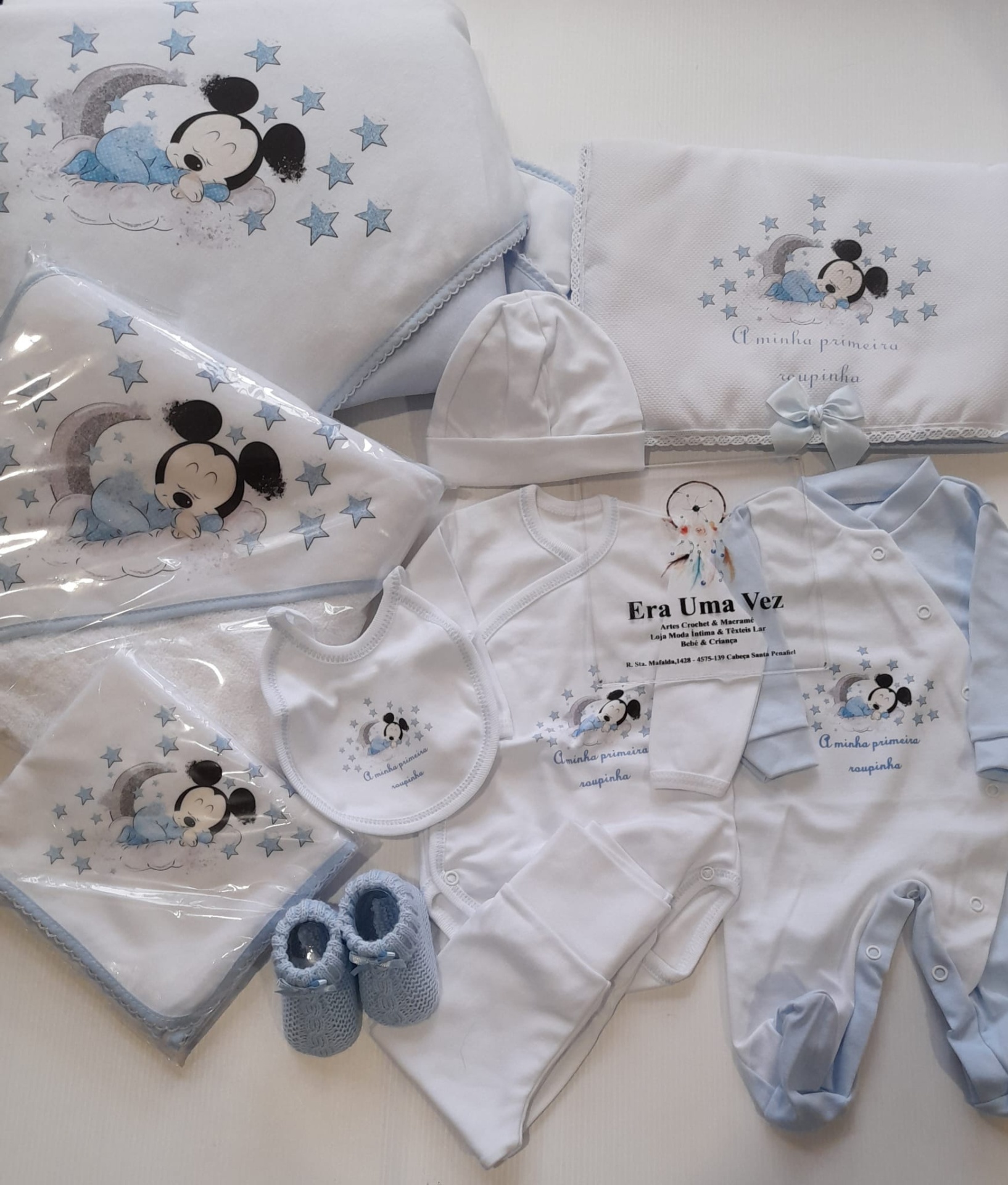 Este delicado conjunto é ideal para os primeiros dias do bebé, reunindo peças essenciais em algodão macio, com detalhe estampado da Minnie ou do Mickey.