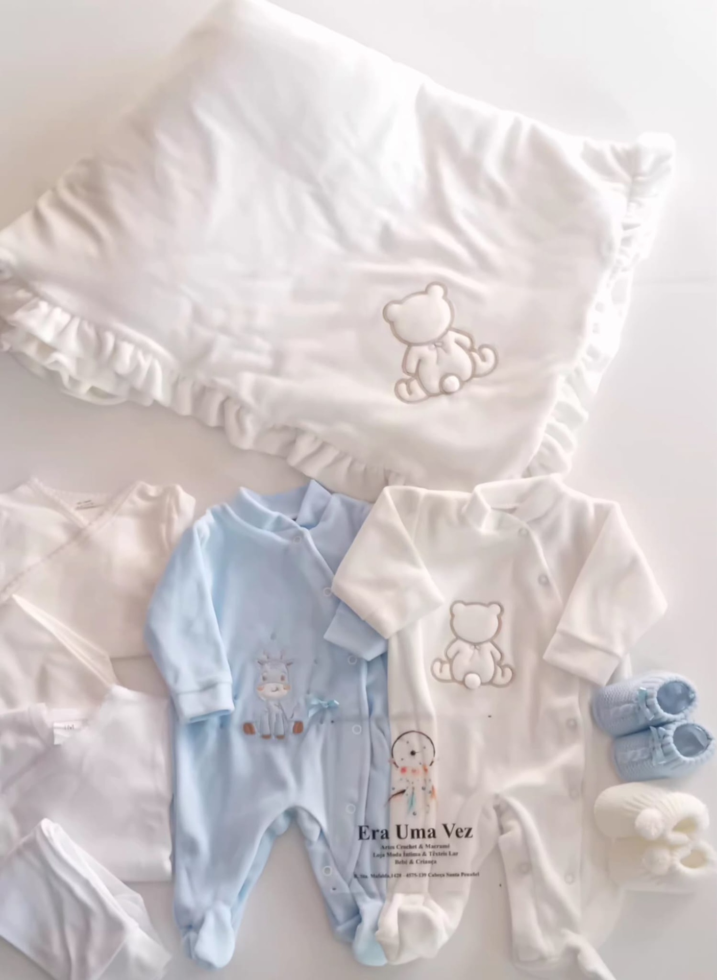 Conjunto maternidade 9 peças : manta veludo, 2 babygrow veludo, 2 bodies, 2 calças   com carda, 2 sapatinhos