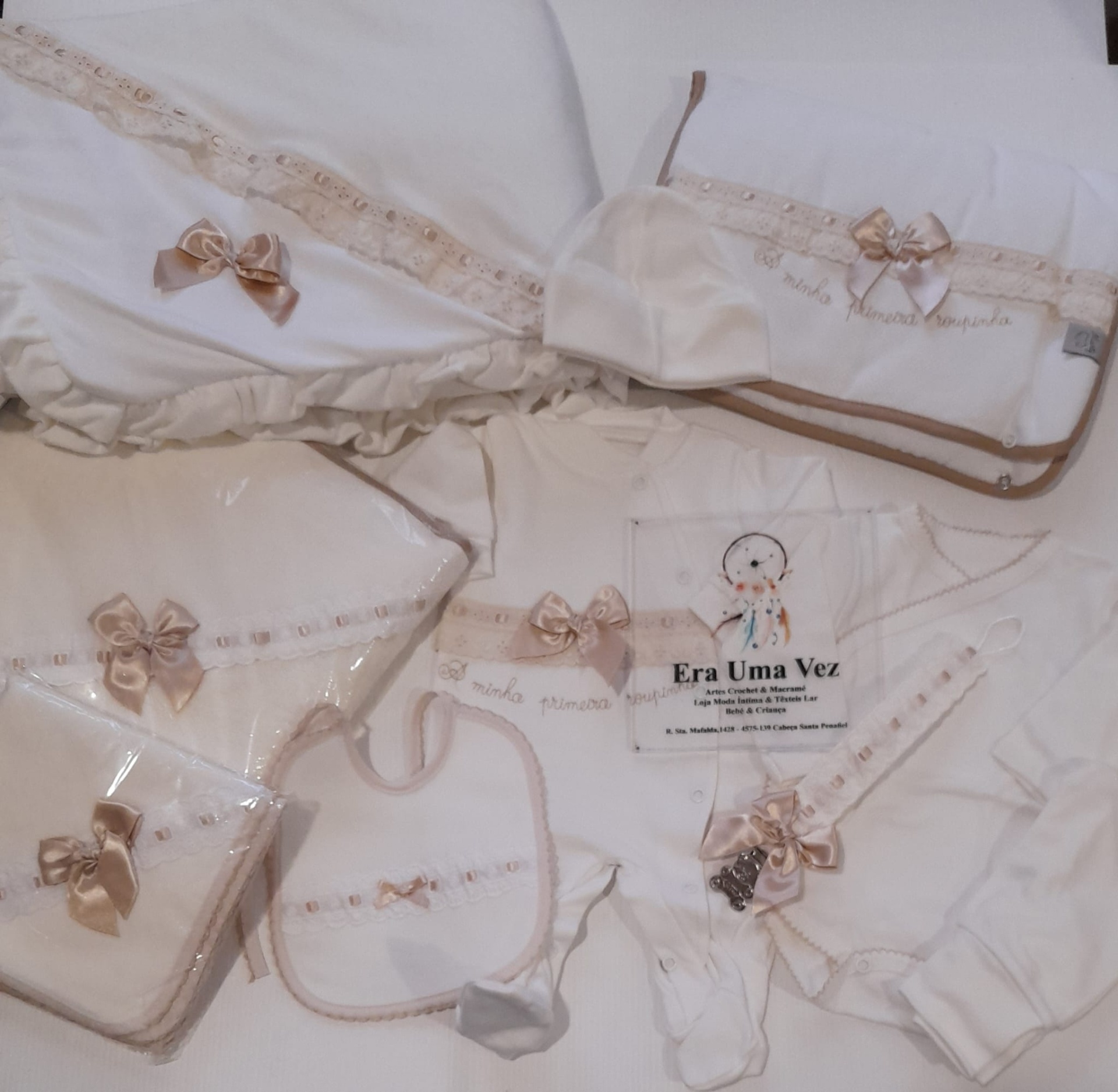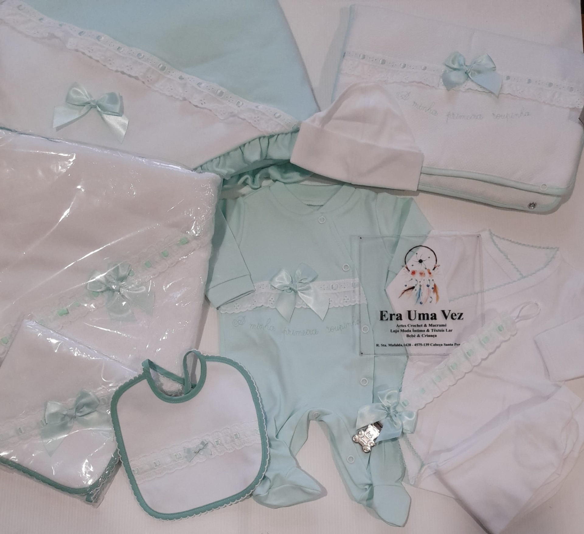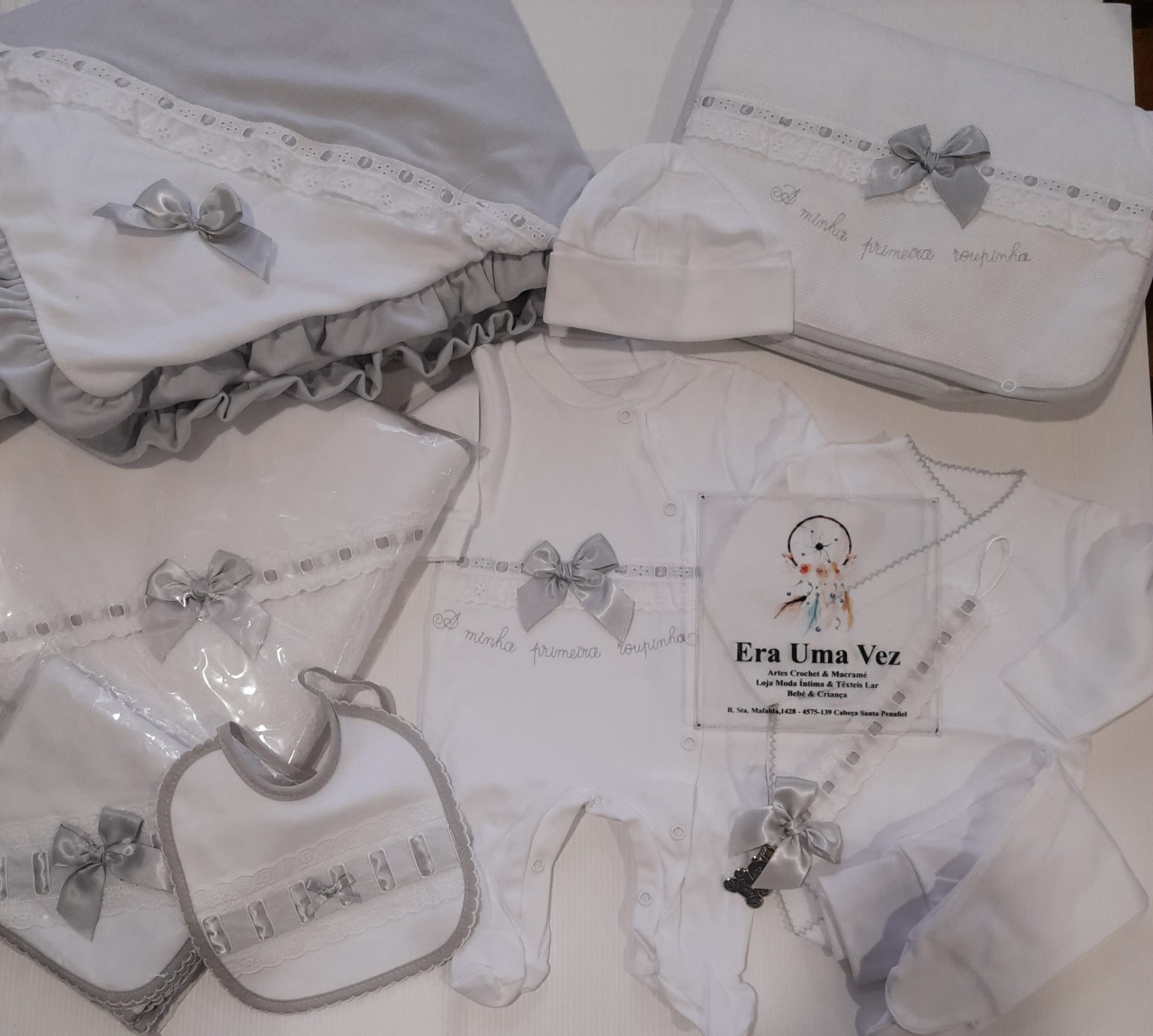 Este delicado conjunto é ideal para os primeiros dias do bebé, reunindo peças essenciais em algodão macio, com detalhes em bordado inglês que conferem um toque clássico e elegante.