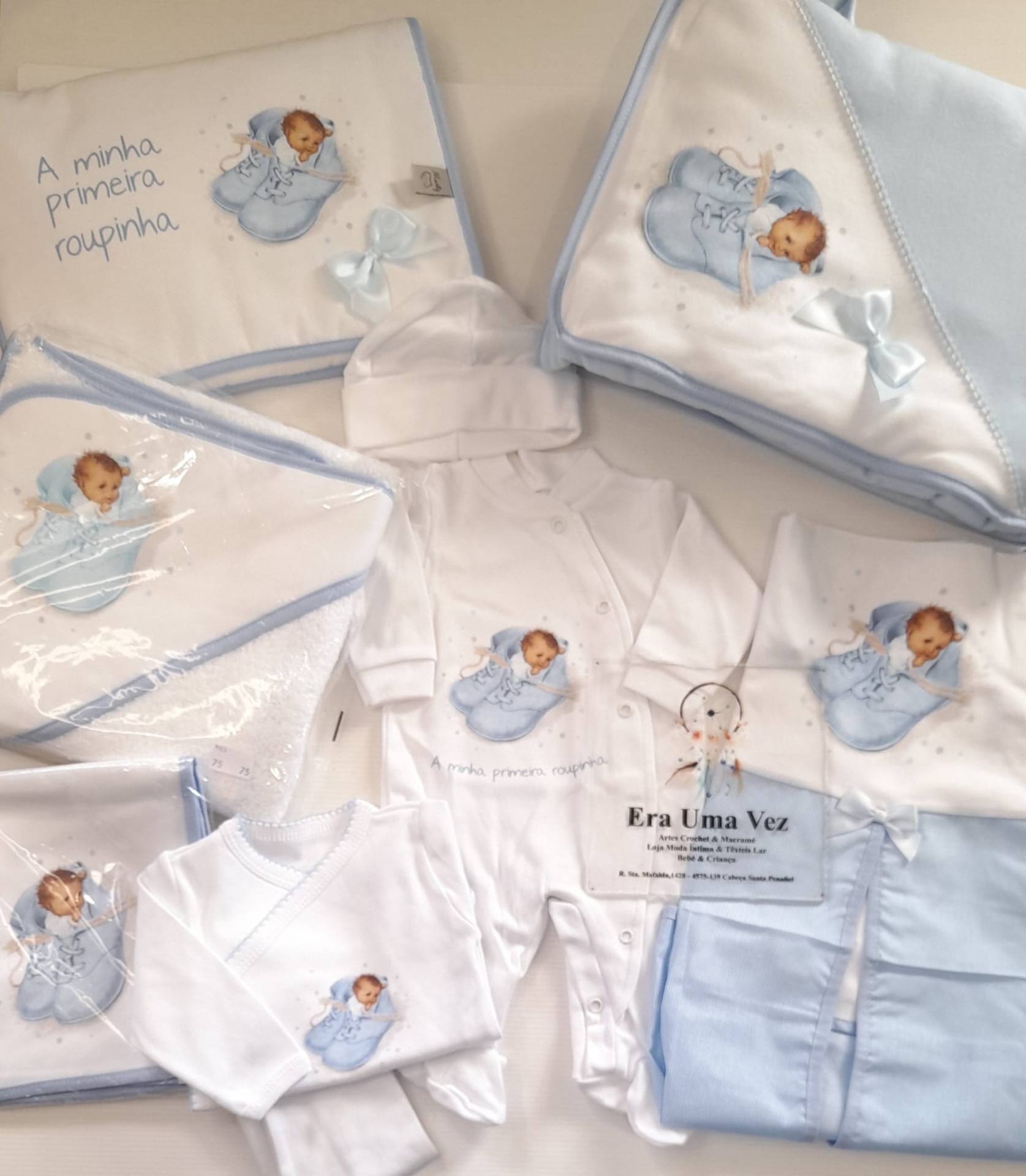 Este delicado conjunto é perfeito para os primeiros dias do bebé, reunindo as peças essenciais em algodão macio, com um encantador detalhe estampado de um bebé num sapatinho.