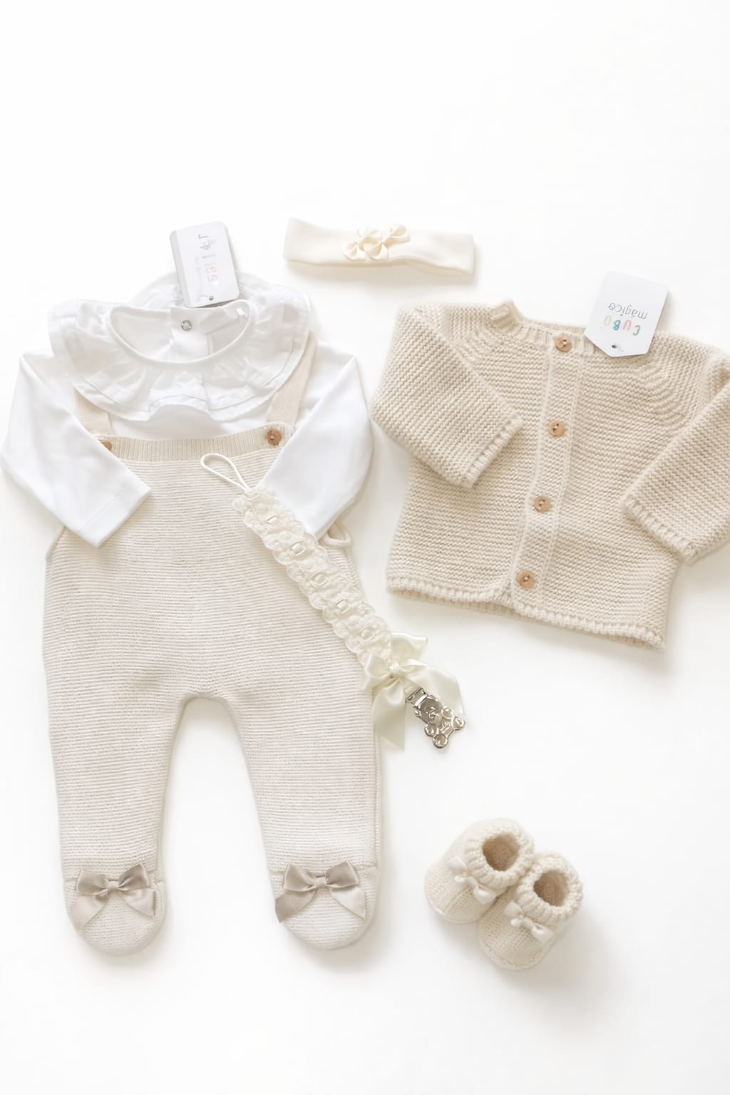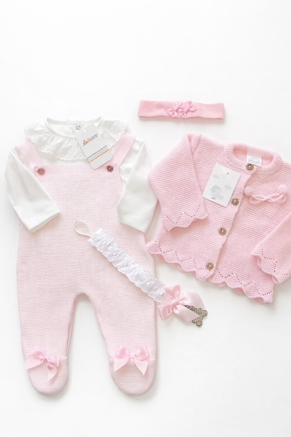 Este conjunto completo inclui jardineira com laços, body com gola, casaco,prendedor chupeta e fita , criando um look clássico, elegante e extremamente confortável para a tão especial ida para casa.