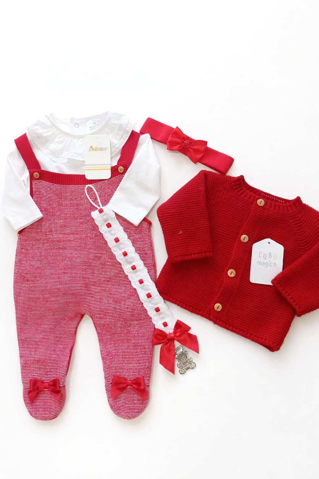 ✔ Inclui jardineira com laços, body com gola, casaco ,prendedor de chupeta e fita.
