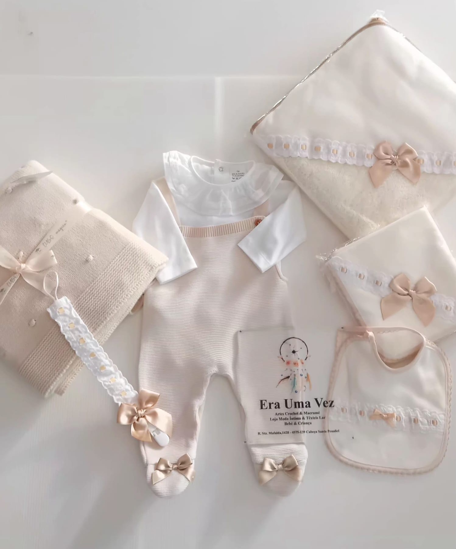 Conjunto de roupa e acessórios para bebé em branco e bege com laços e renda