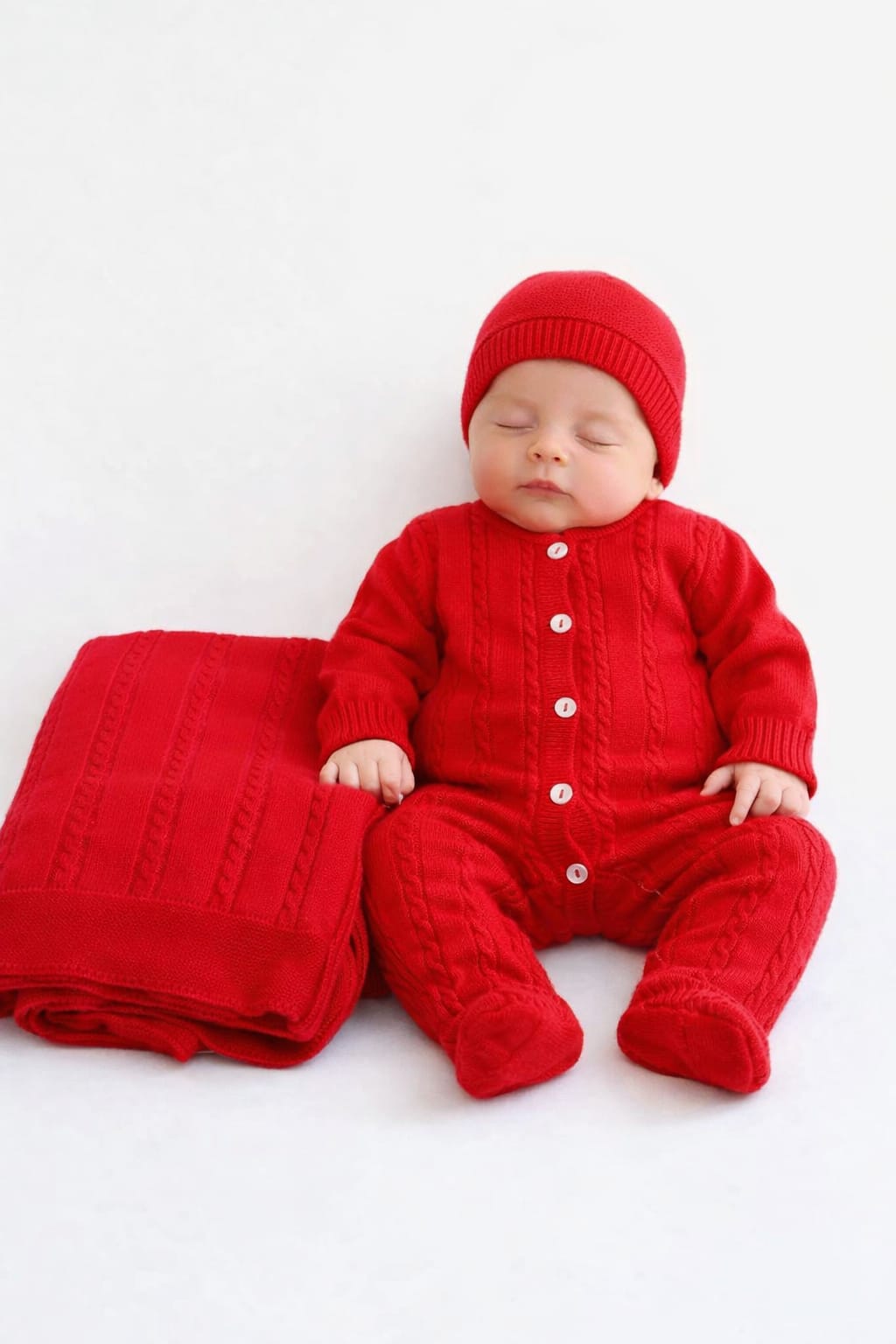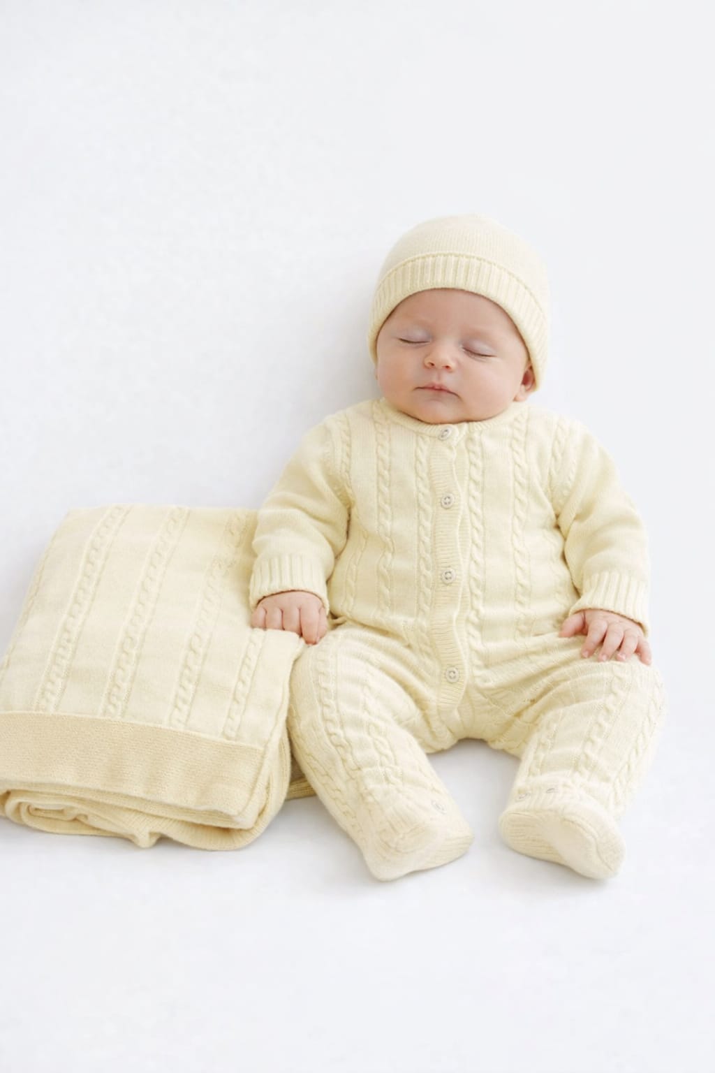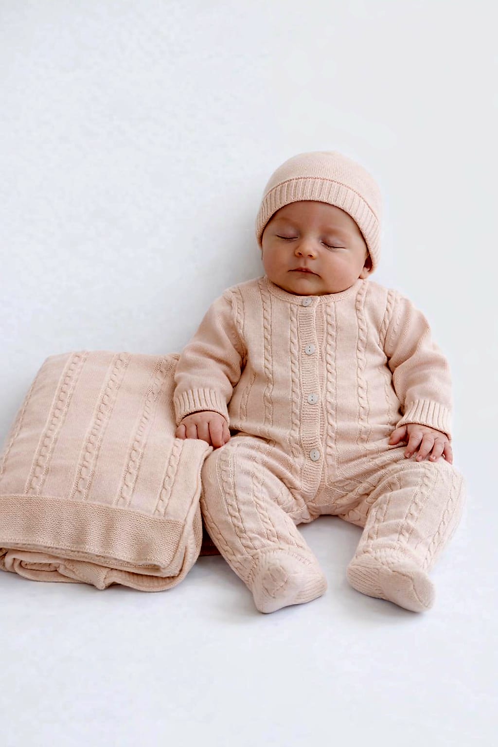 Composto por babygrow com abertura de botões, manta trabalhada (90x90 cm), gorro e carapins, envolve o recém-nascido num toque extremamente macio e aconchegante, semelhante ao da lã, mas com a leveza e respirabilidade ideais para a pele sensível do bebé.
