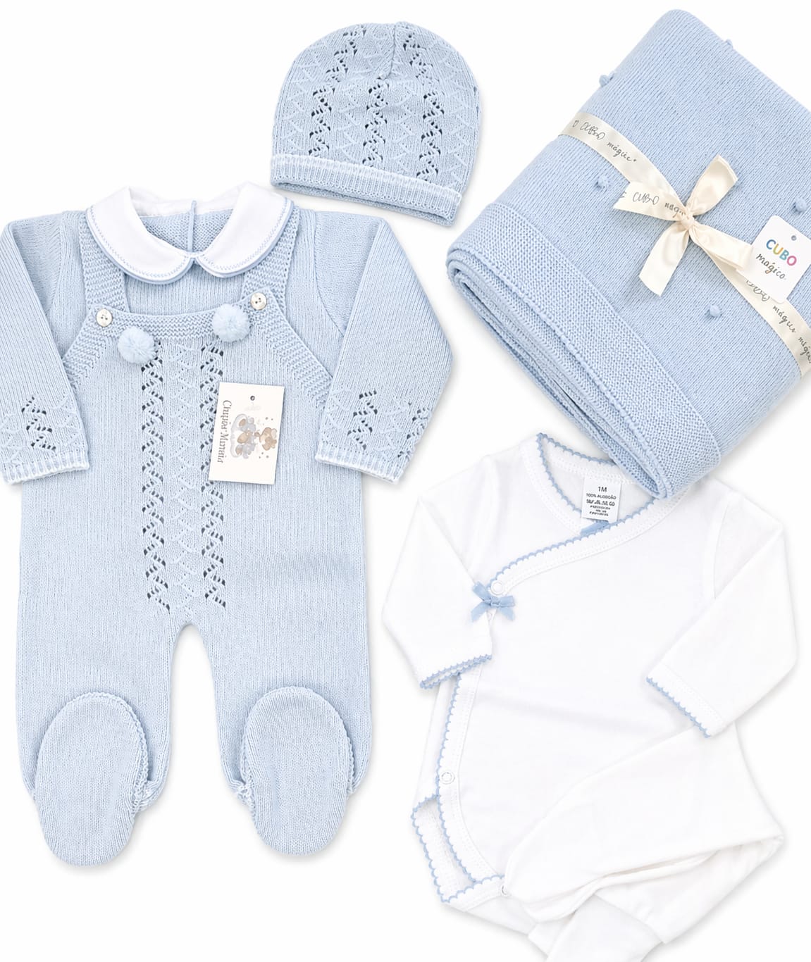 Jardineira, camisola e gorro Body trespasse e calça Manta trabalhada (90x90 cm) ✔ Tamanho único: 0–3 meses ✔ Composição: 100% algodão