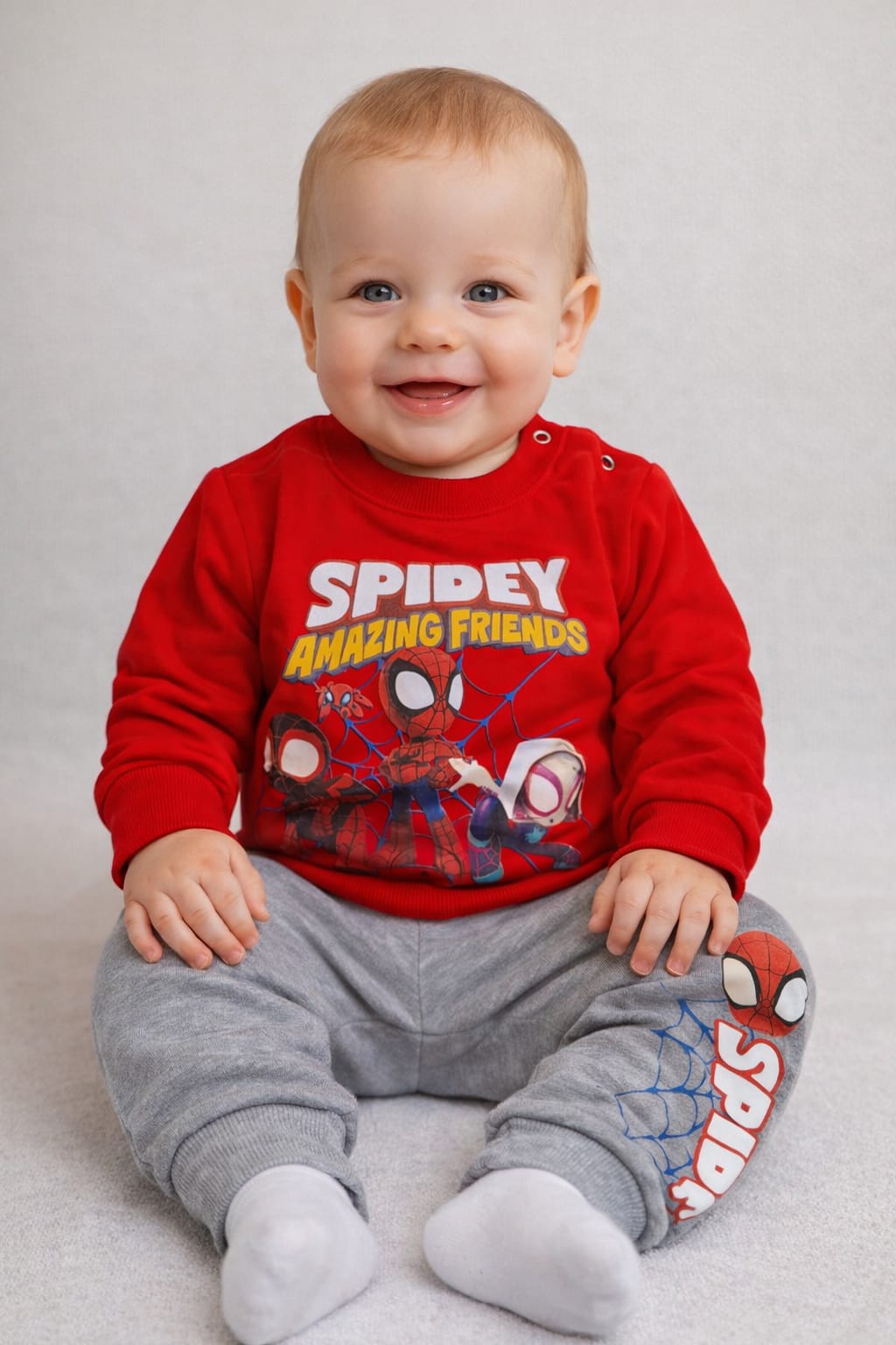 Bebé com conjunto vermelho e cinzento com tema Homem-Aranha