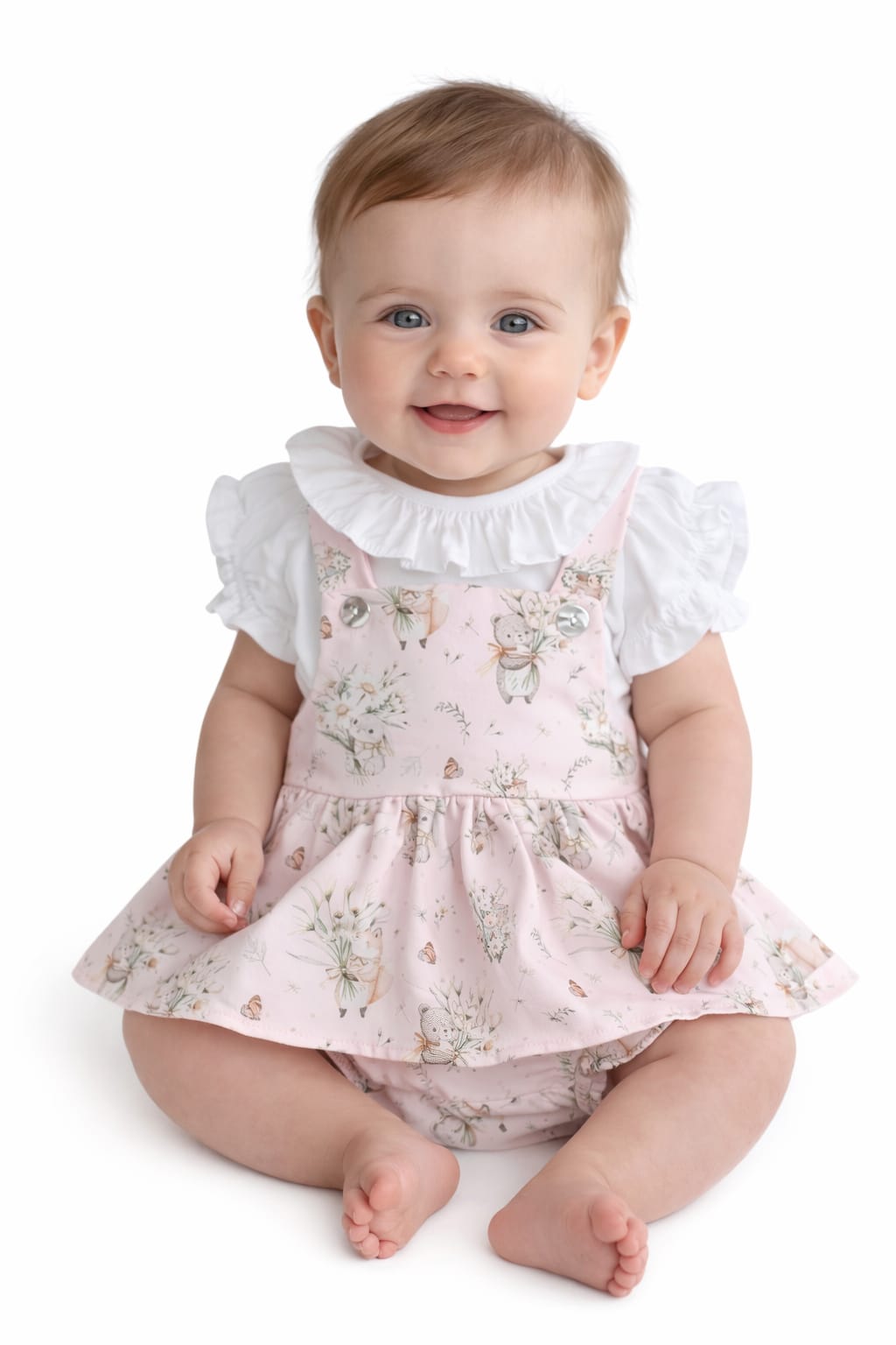 Blusa com folho e saia tapa-fralda para bebé, perfeito para manter o seu bebé confortável e cheio de estilo nos dias mais quentes. Um conjunto prático, delicado e ideal para o dia a dia ou momentos especiais.