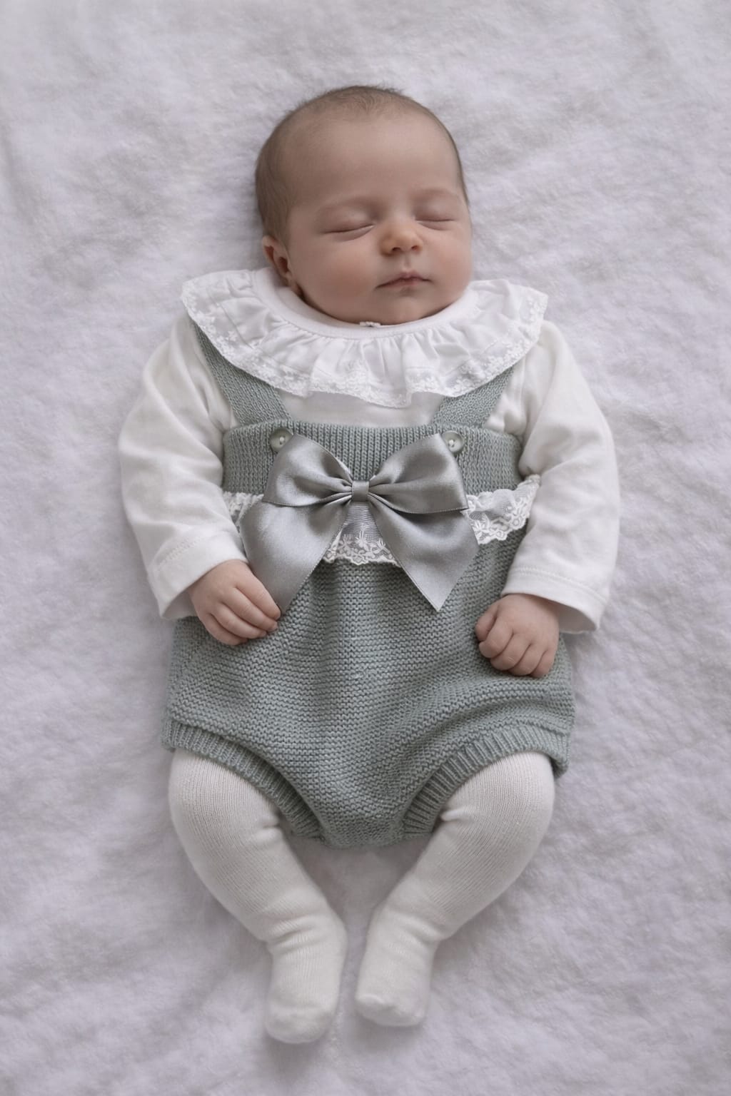 Bebé vestido com body branco e macacão cinza com laço, deitado sobre superfície branca fofa.