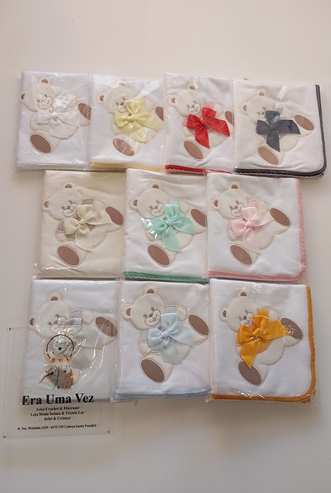 Fralda em tecido de algodão com urso laço em cetim . Vies colorido com picueta.