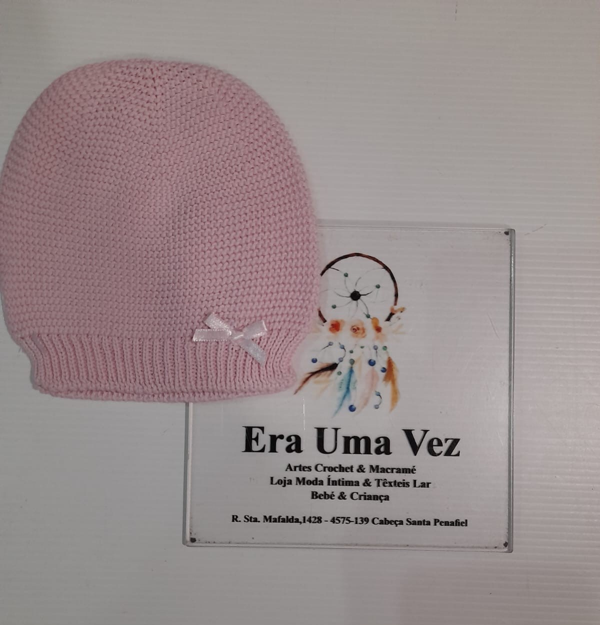 Gorro rosa de malha com laço e placa de loja com texto e imagem