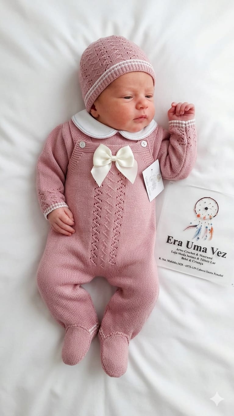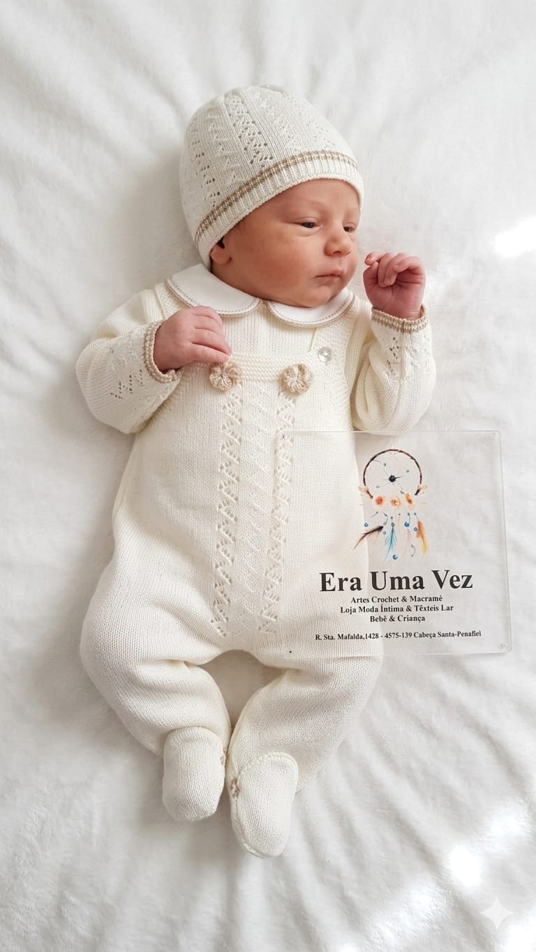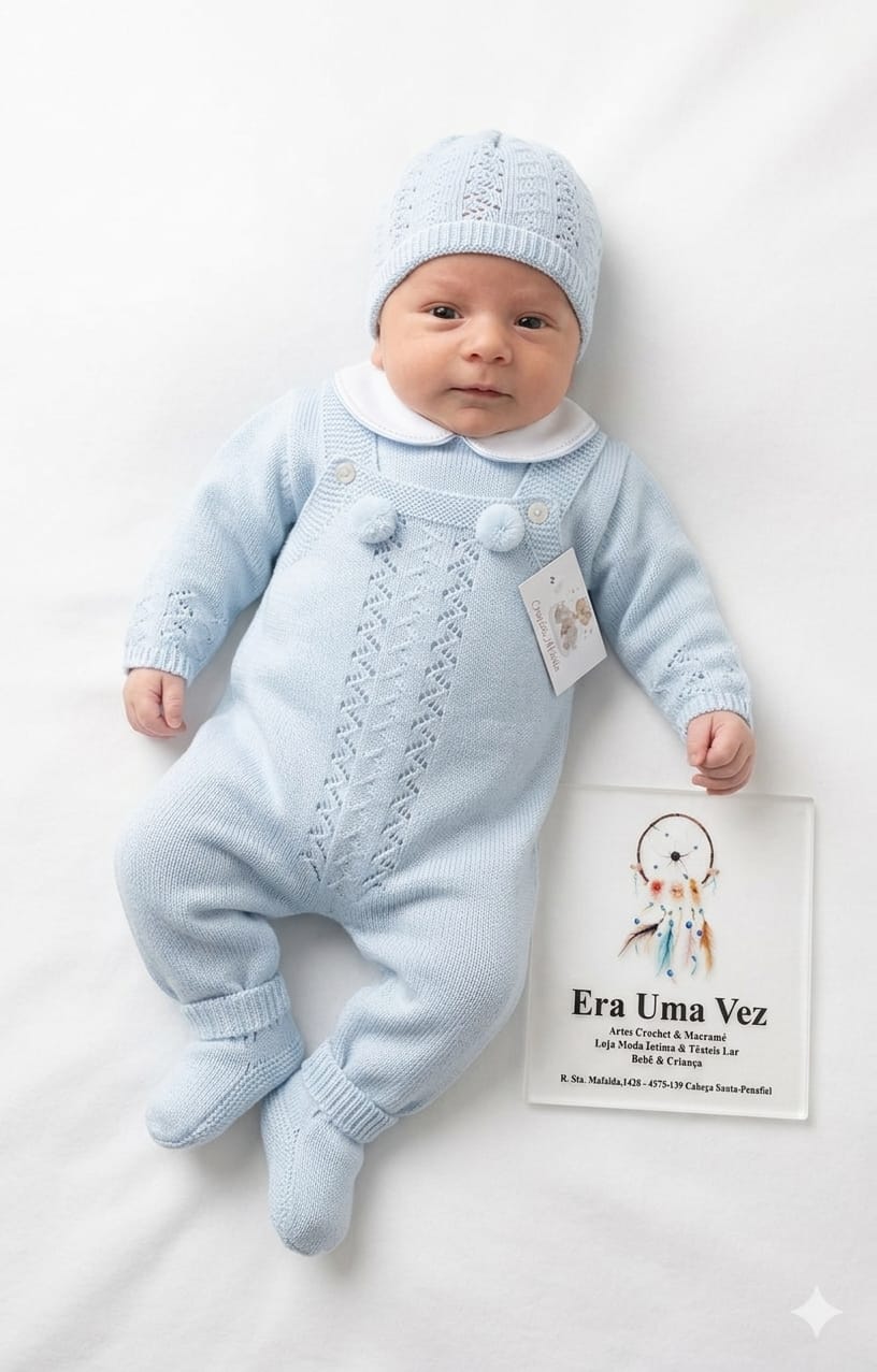 Inclui jardineira com pé, camisola com gola em contraste e gorro.
