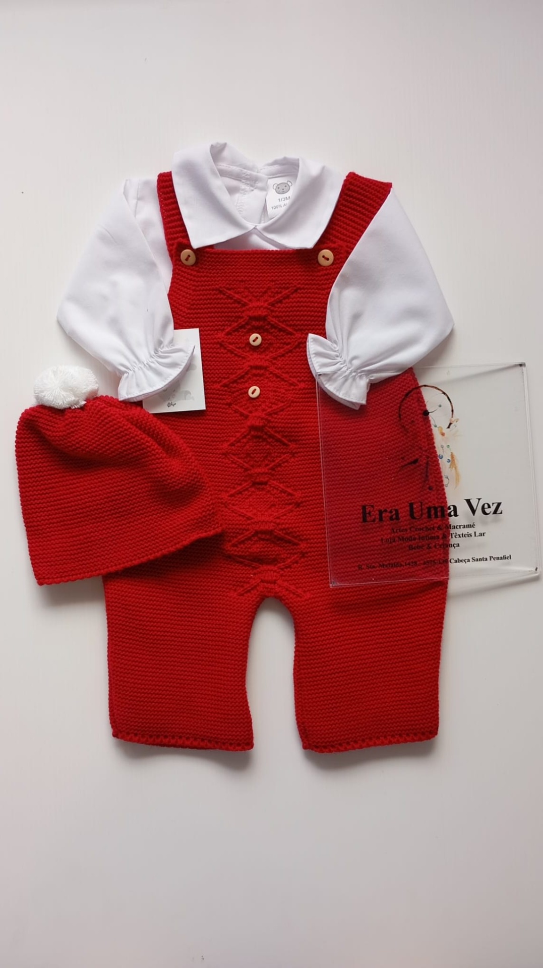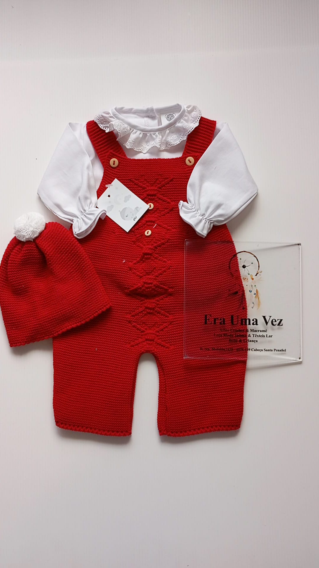 Jardineira malha , blusa de bebé  e gorro pompom.