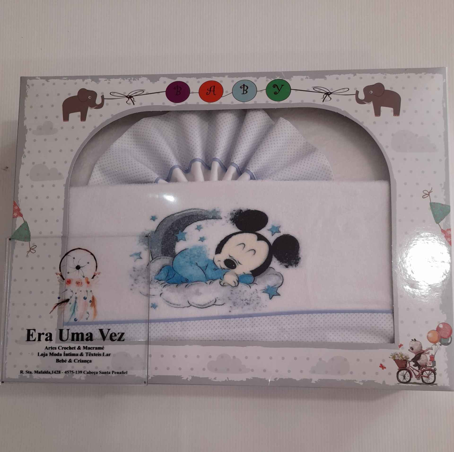 roupa de bebê branca e azul com personagem a dormir em caixa decorativa
