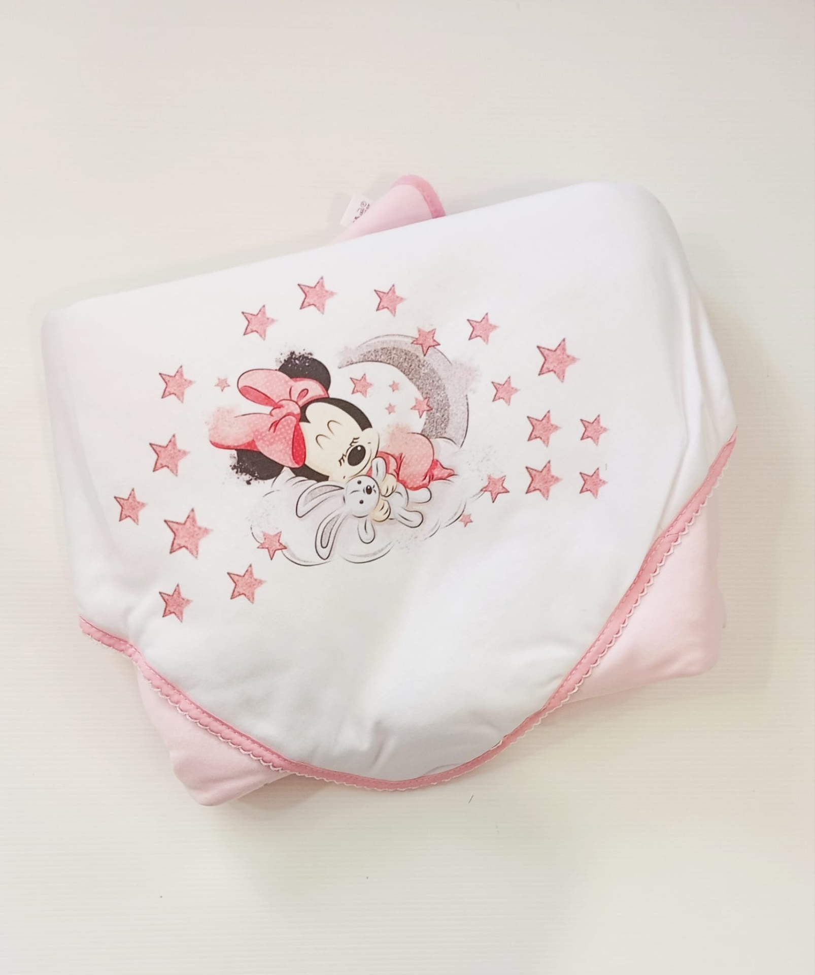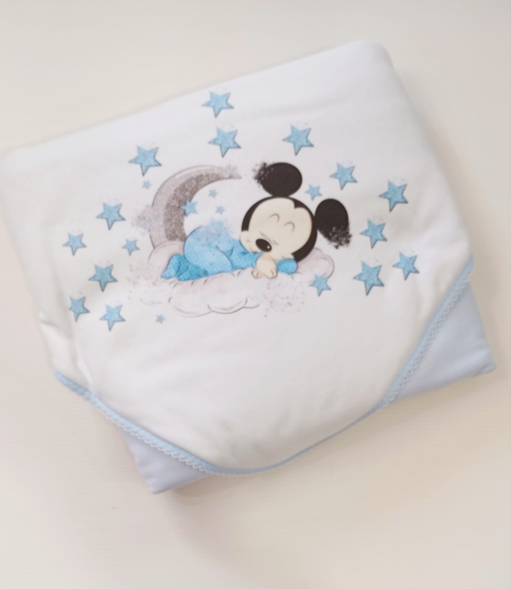 Manta delicada e confortável, ideal para envolver o bebé com suavidade e segurança. Feita em tecido 100% algodão, é macia, respirável e perfeita para a pele sensível do bebé. O detalhe do desenho  Minnie ou Mickey  torna a manta ainda mais especial, sendo uma ótima opção para o enxoval ou para oferecer como presente.