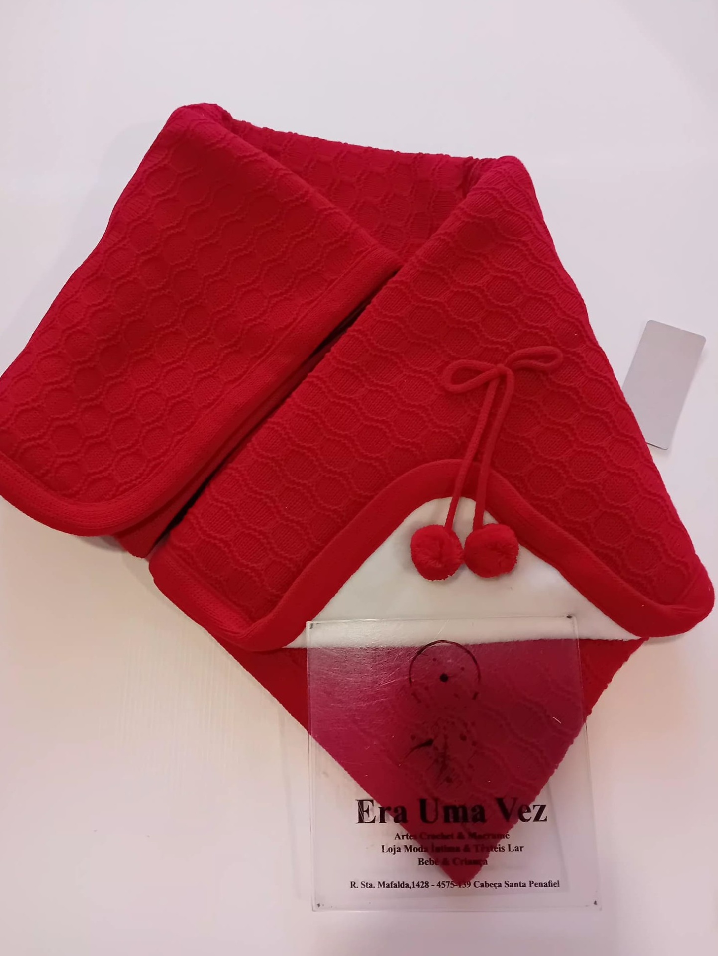 Cachecol vermelho com pompons e placa transparente com texto Era Uma Vez.