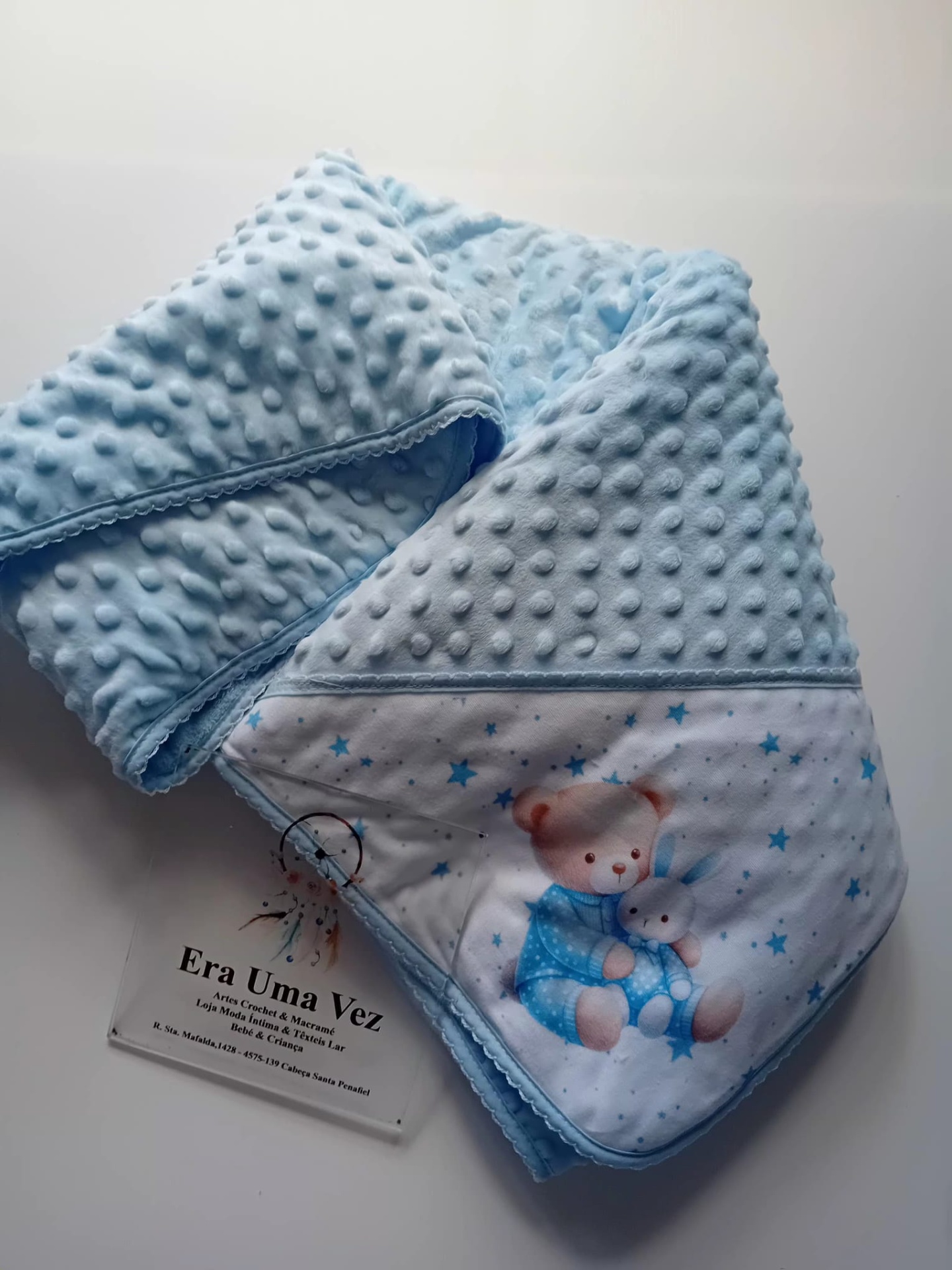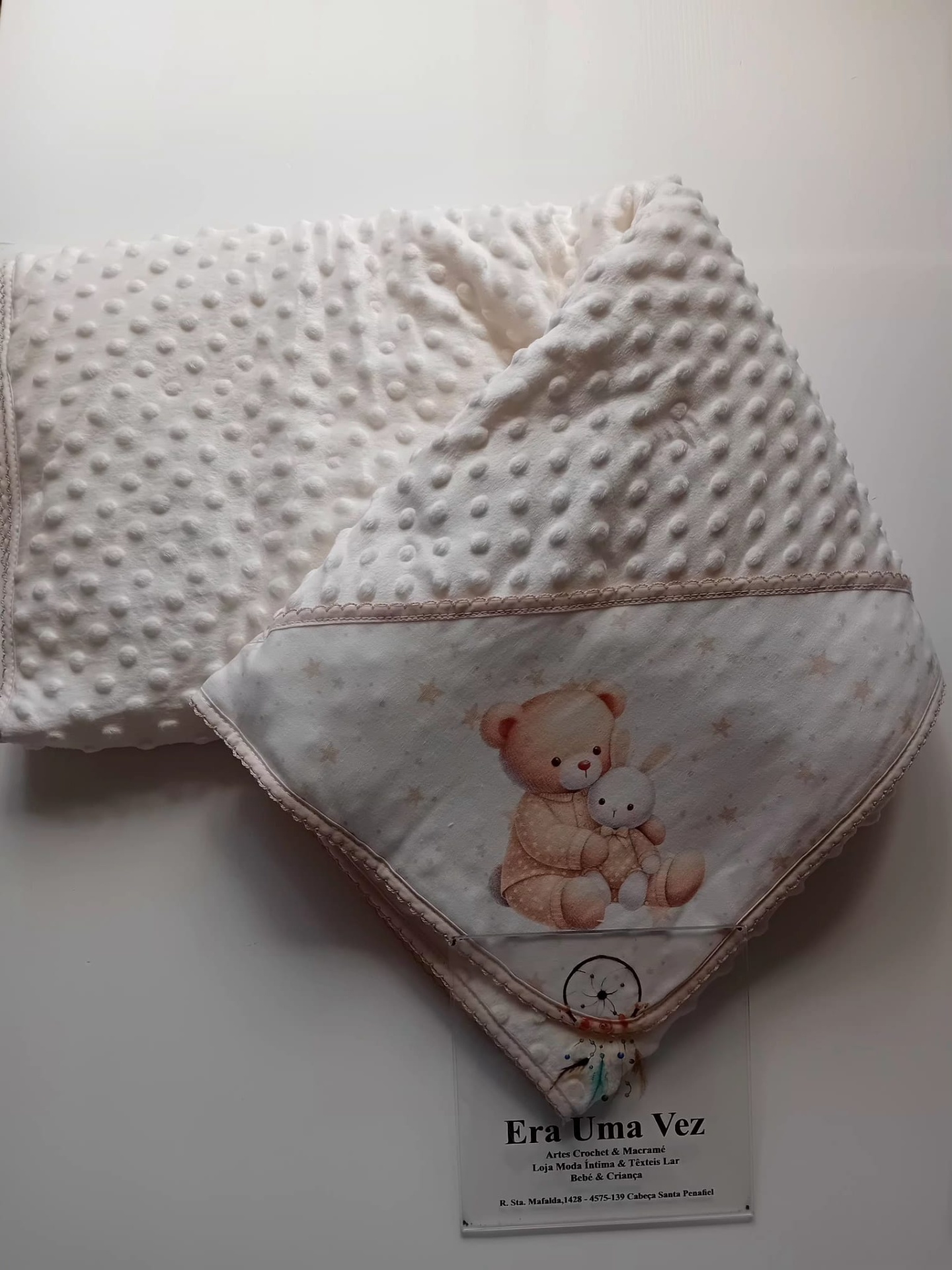 Manta de bebé branca com textura de bolinhas e ilustração de urso e coelho num canto