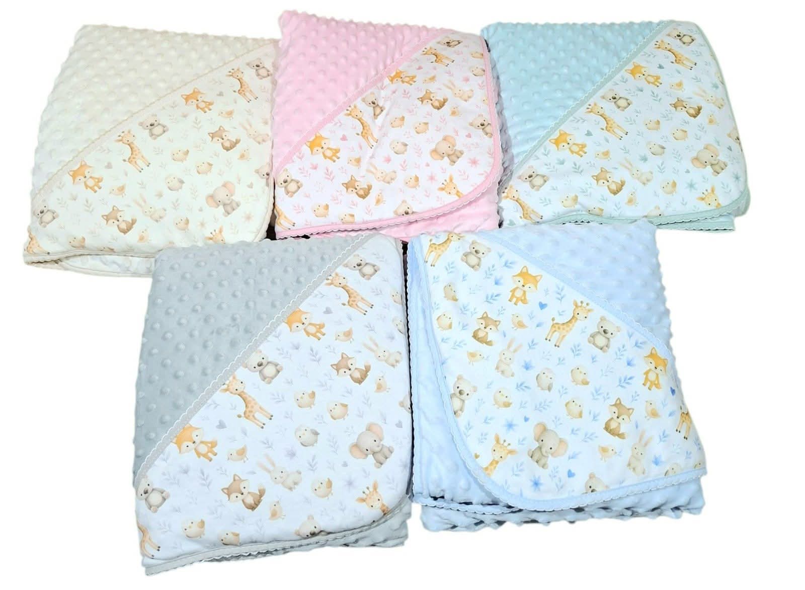 Cinco mantas para bebé coloridas com textura de bolha e estampados de animais.