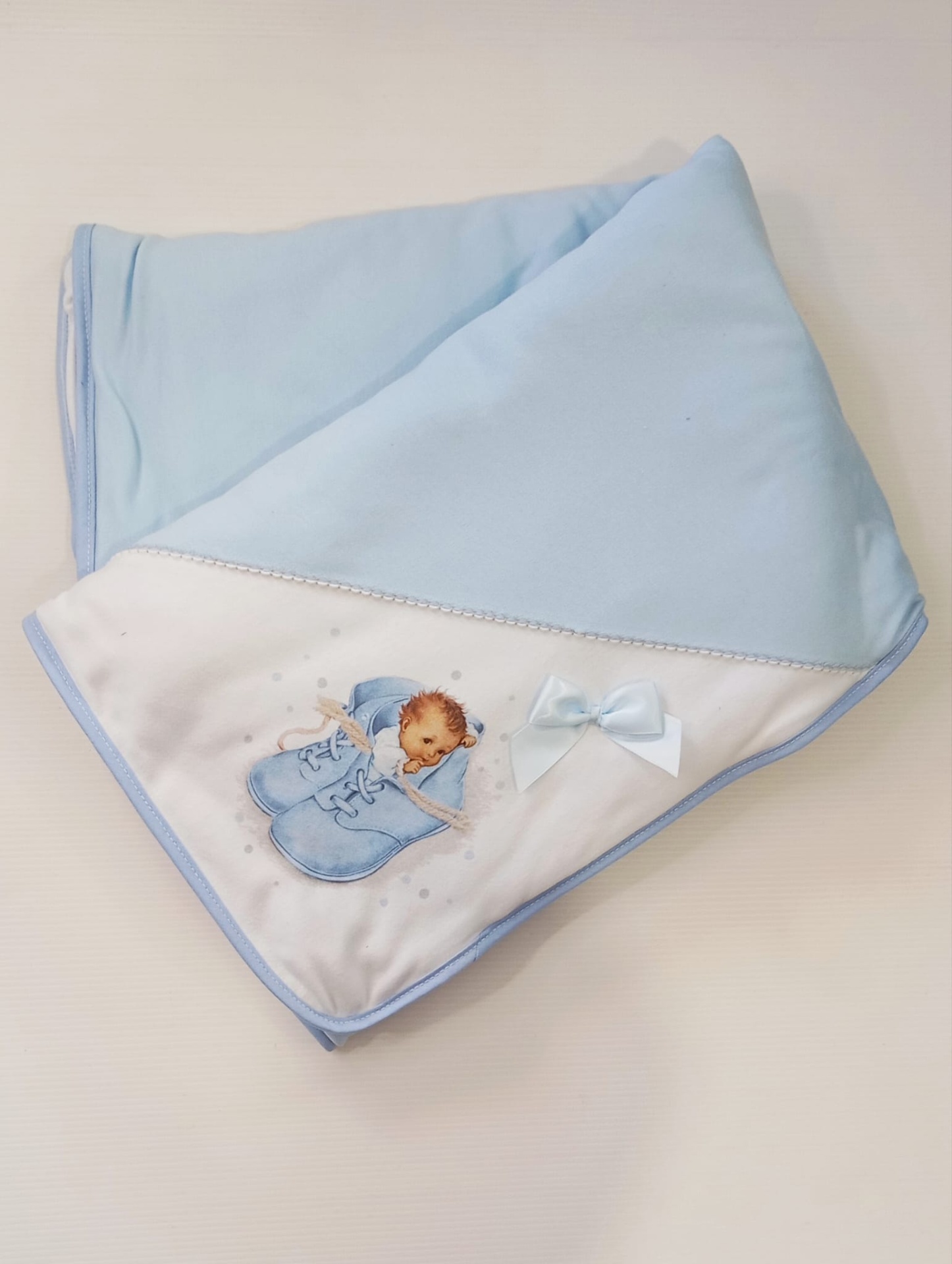 Manta delicada e confortável, ideal para envolver o bebé com suavidade e segurança. Feita em tecido 100% algodão, é macia, respirável e perfeita para a pele sensível do bebé. O detalhe do desenho   torna a manta ainda mais especial, sendo uma ótima opção para o enxoval ou para oferecer como presente.