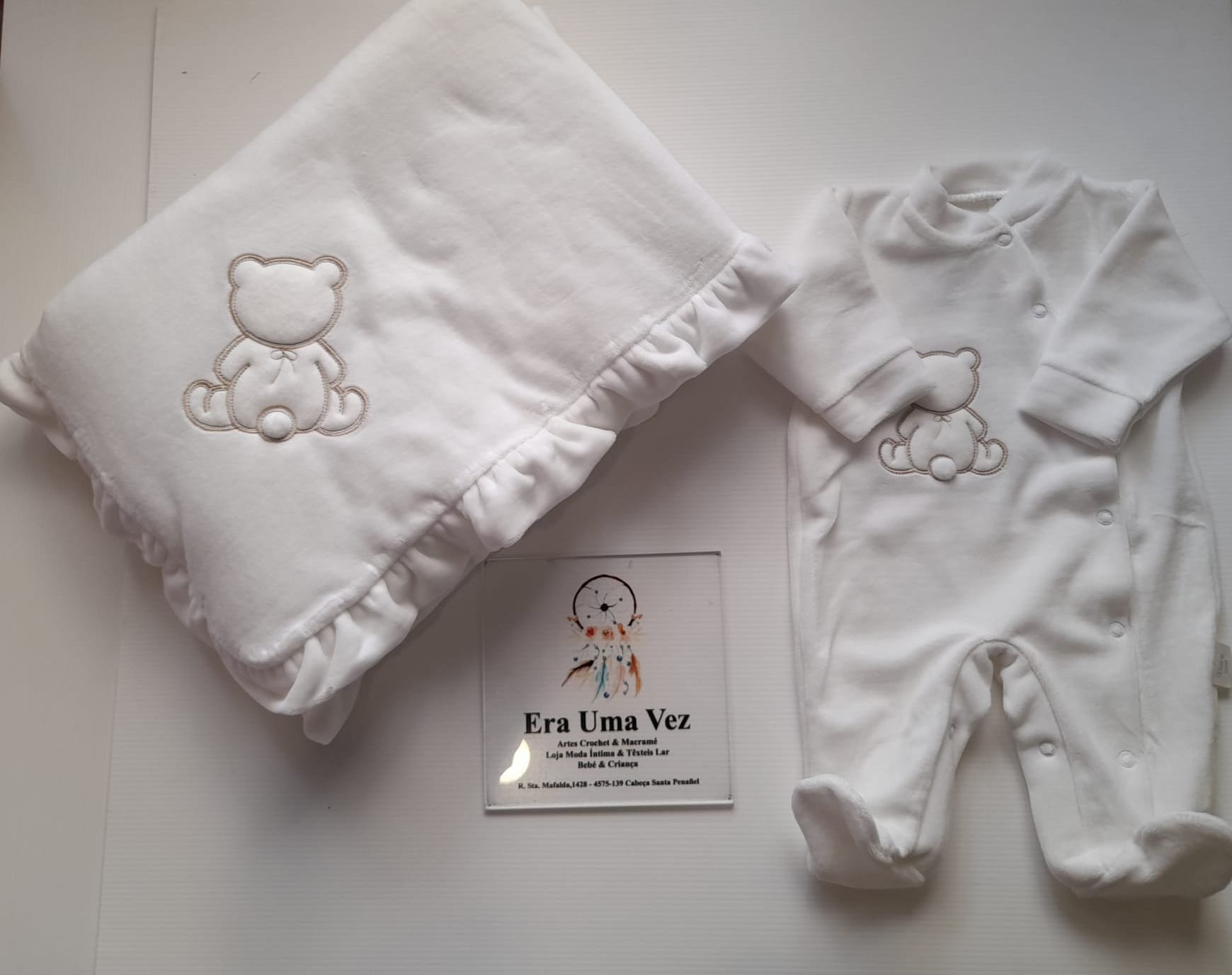 Conjunto manta e babygrow de bebé com ursinho bordado