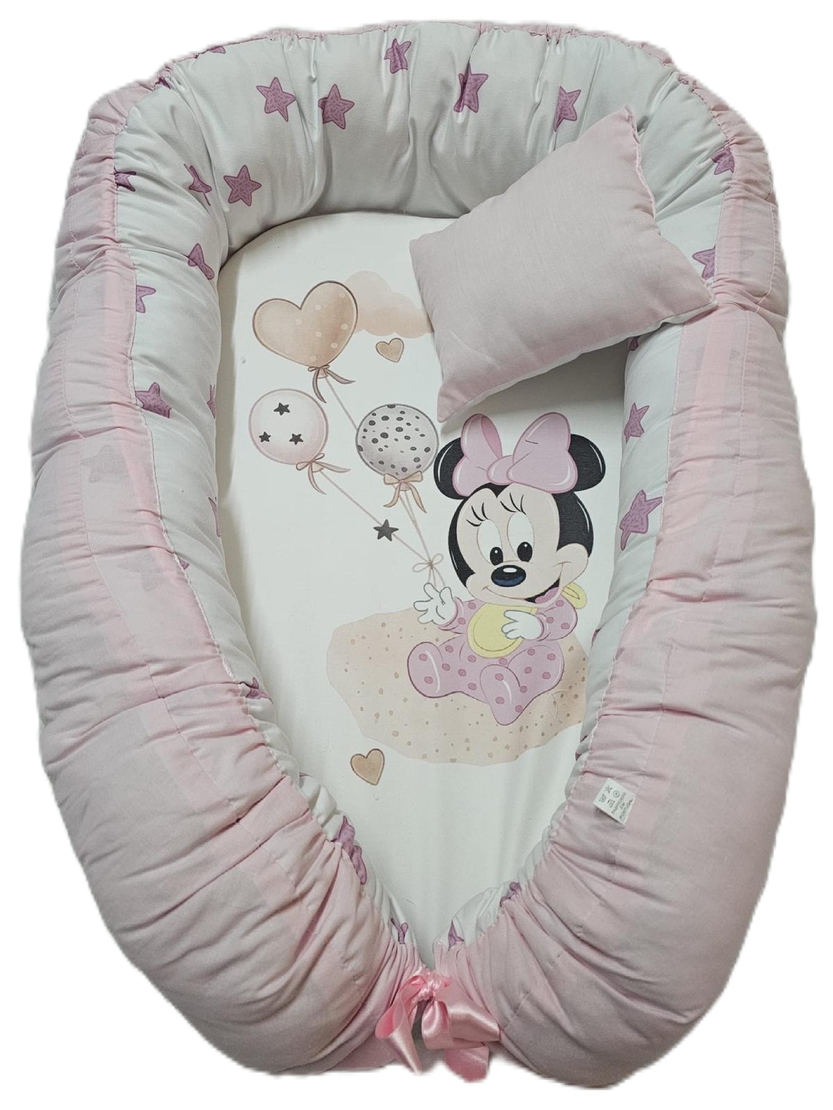 Ninho para bebé rosa com almofada e ilustração da Minnie bebê