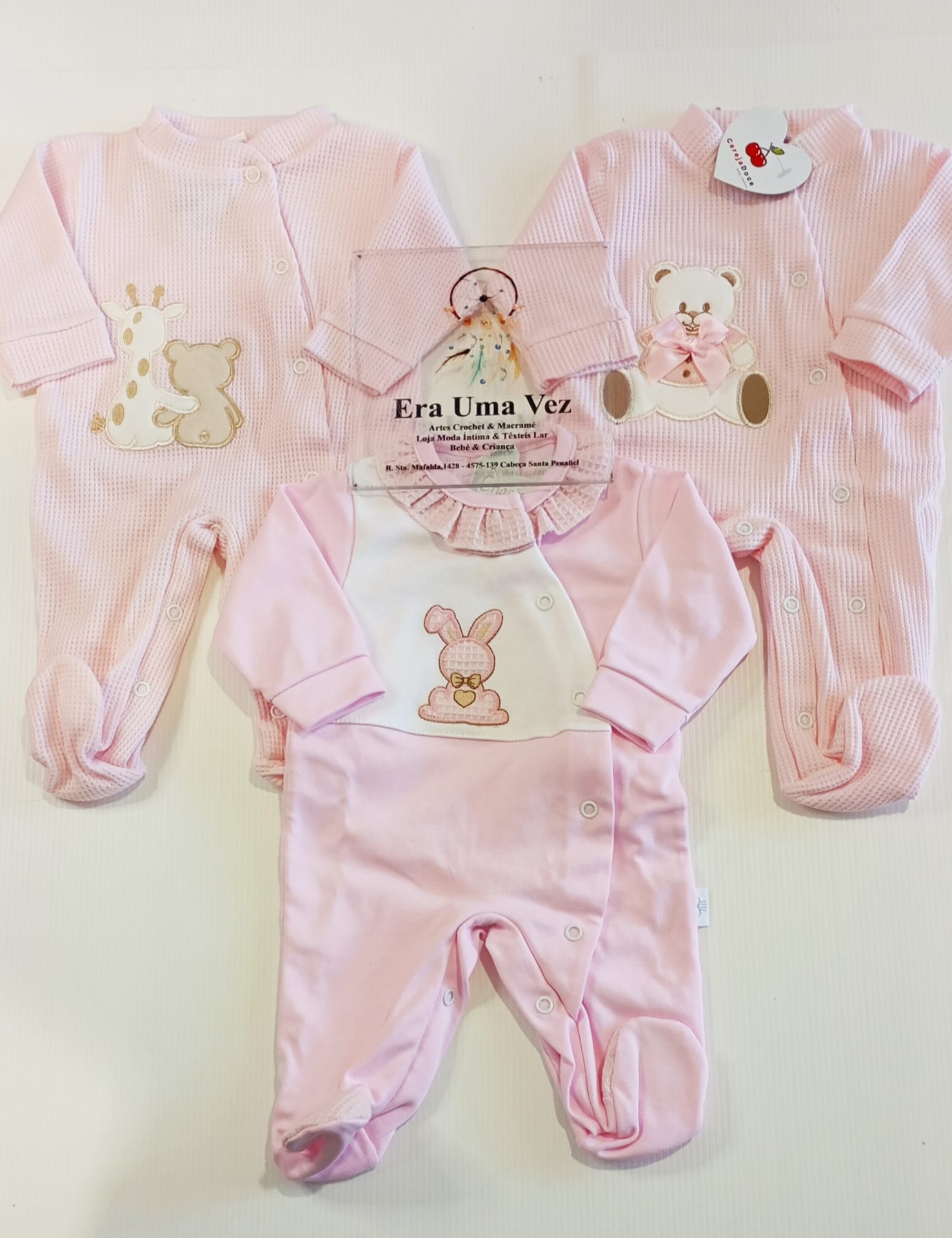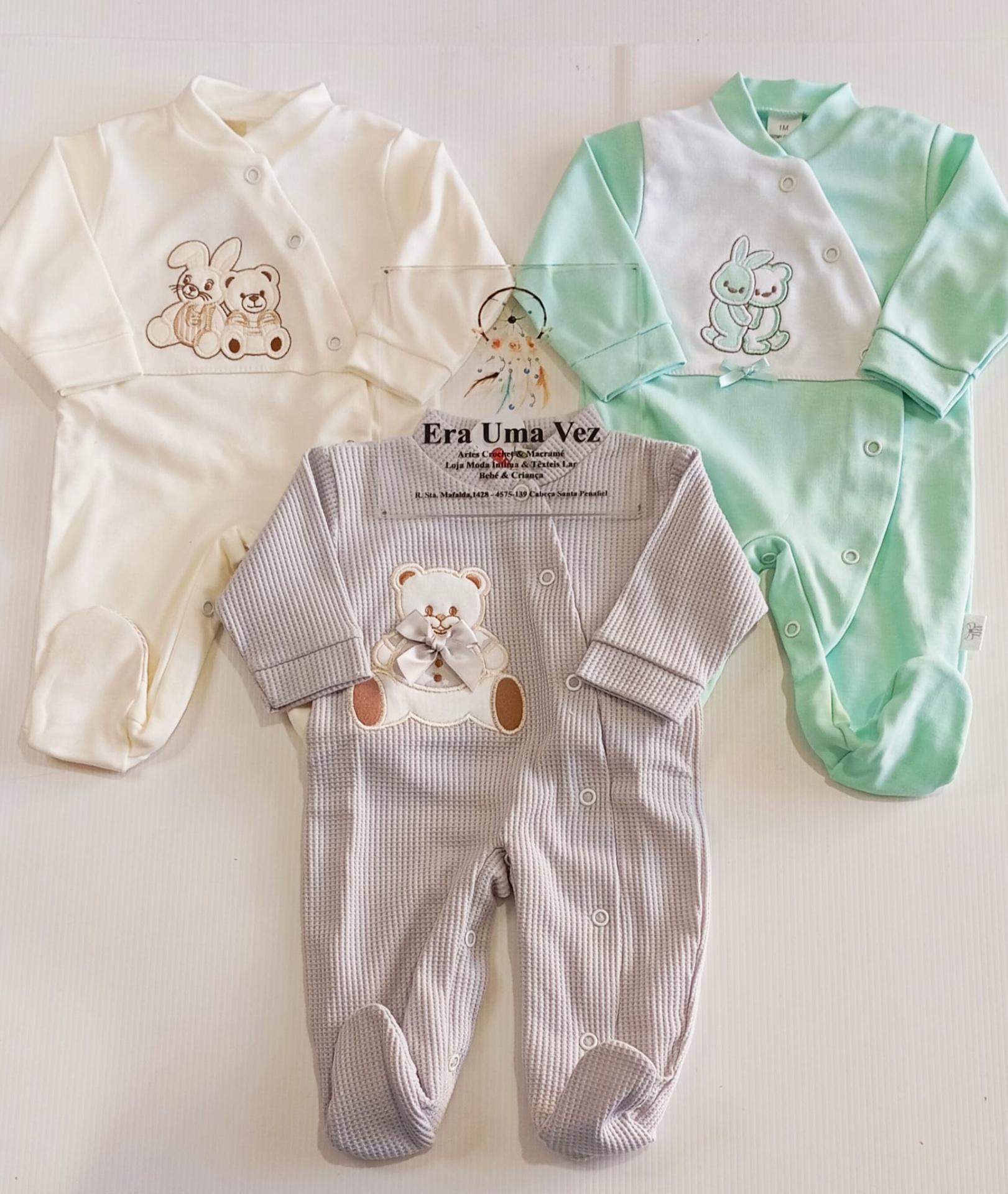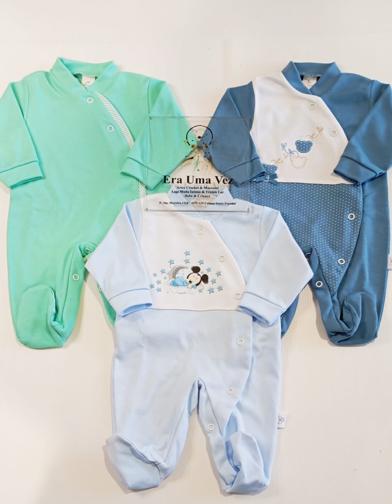 A abertura em molas facilita na hora de vestir e na muda da fralda, tornando estas peças essenciais no enxoval.