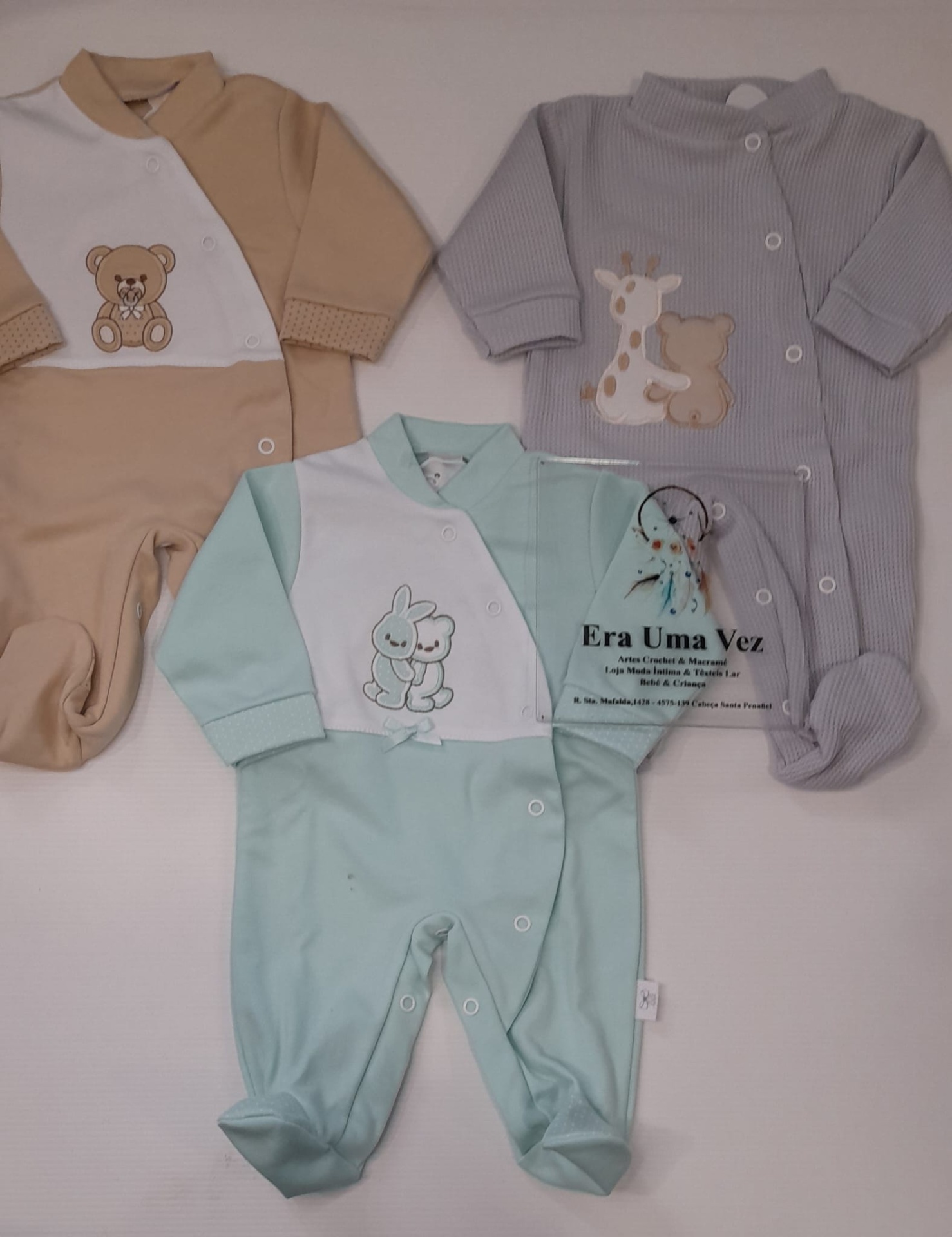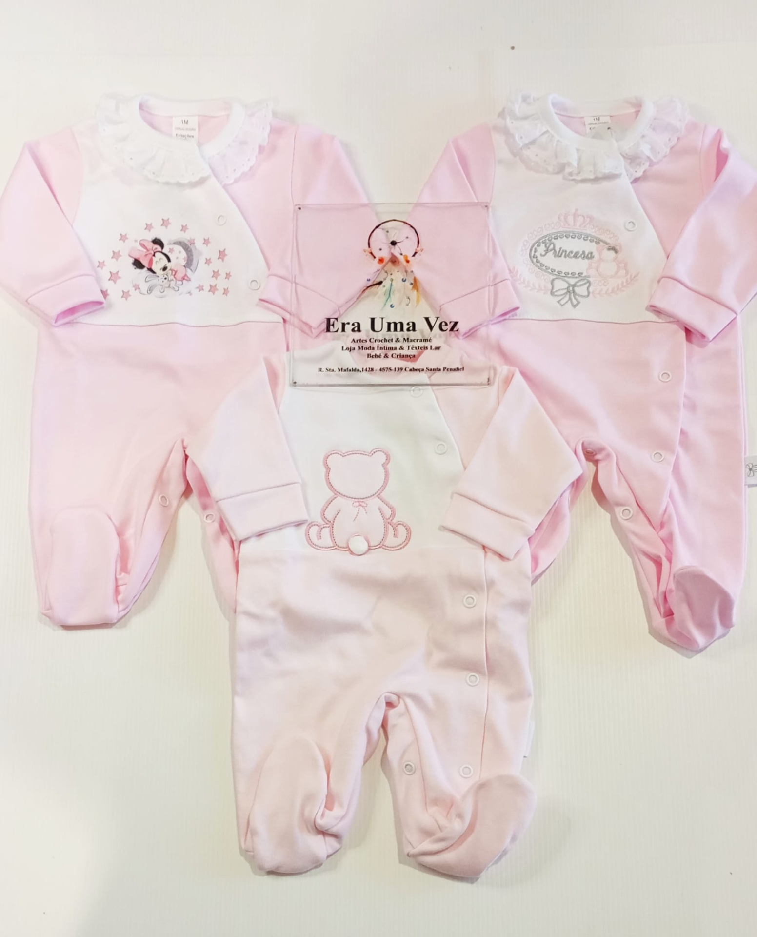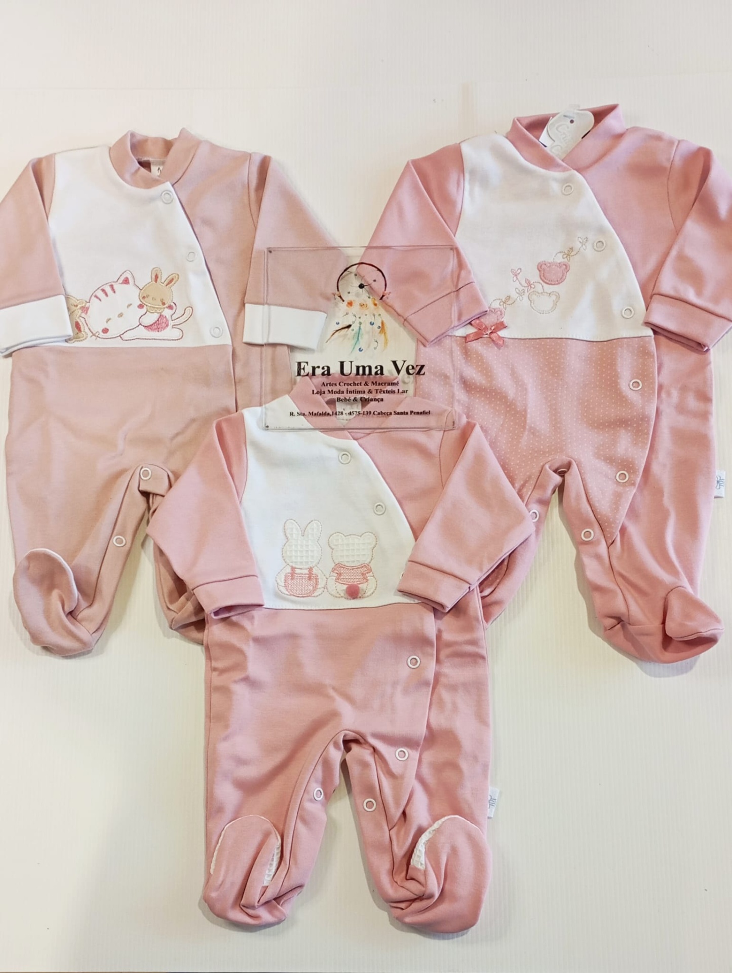 A abertura em molas facilita na hora de vestir e na muda da fralda, tornando estas peças essenciais no enxoval.