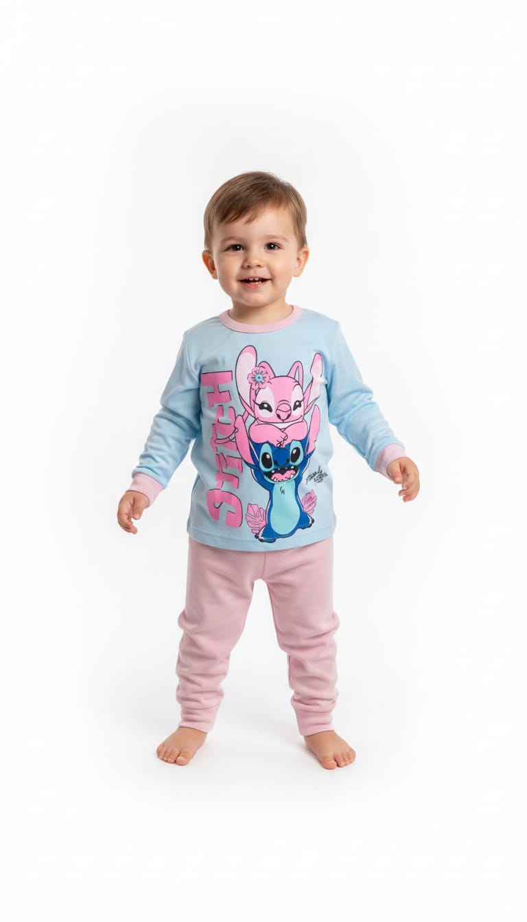 Criança com pijama azul clara e rosa com personagem Stitch