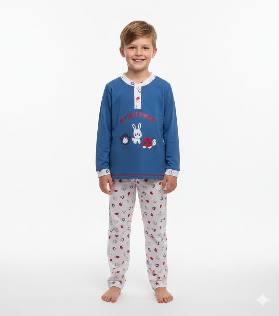 Pijama infantil azul com estampa my best friends e calças brancas estampadas