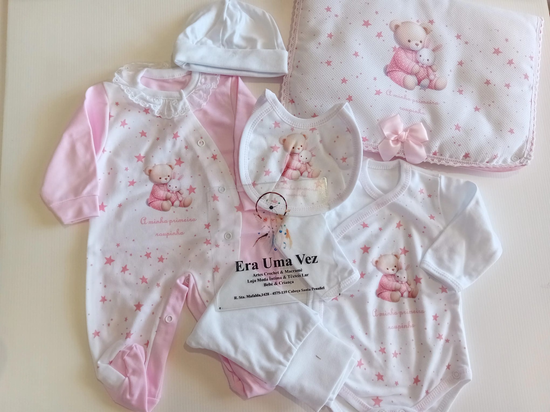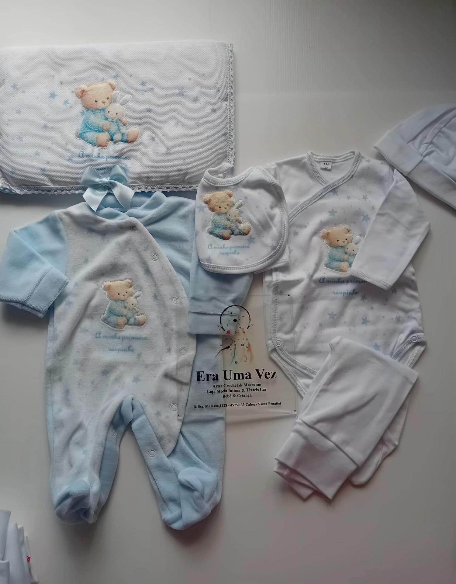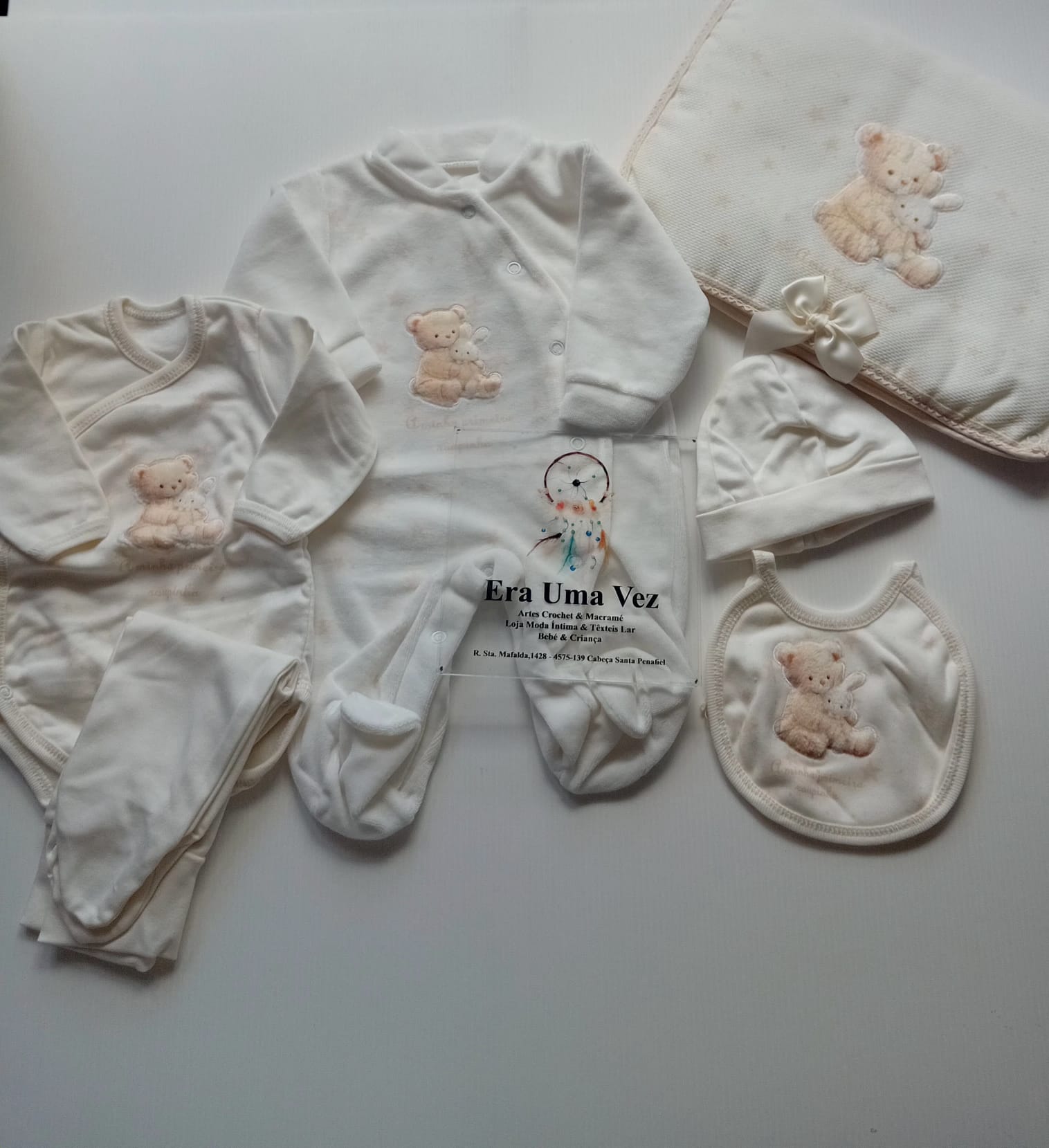 Conjunto de bebé com seis peças: bolsa, gorro, body trespasse cardado, calça, babete e babygrow em tecido laminado.