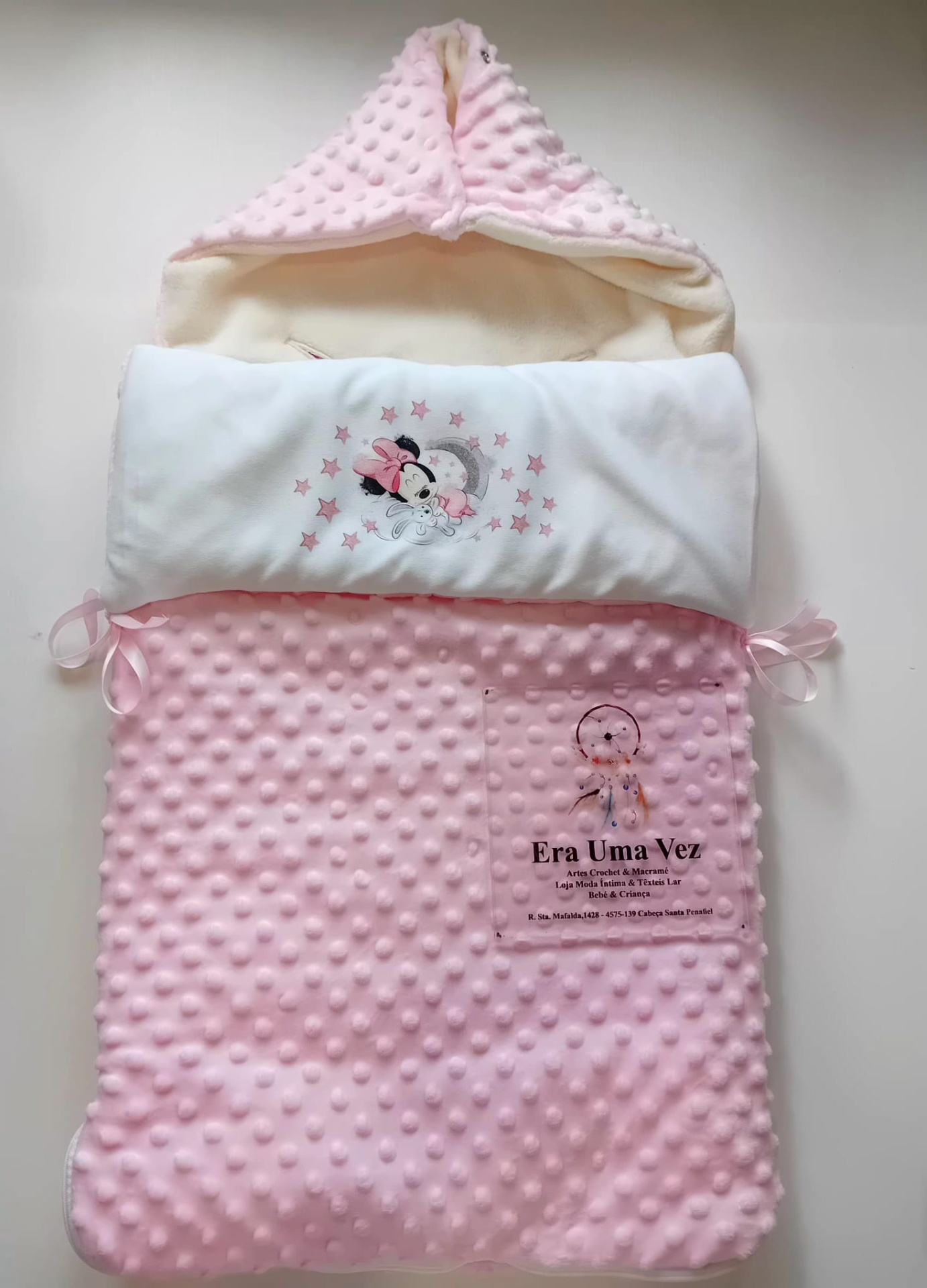 saco de bebé cor-de-rosa com capuz e estampas de Minnie e texto Era Uma Vez